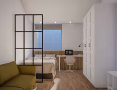 公寓提供Studio 房型,独立卫浴、独立厨房,为学生提供更私密和自在的个人空间。 房间配有双人床、书桌椅、衣柜、穿衣镜等,有充足的储物空间。厨房配有灶台、冰箱、烤箱等。