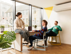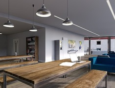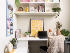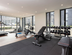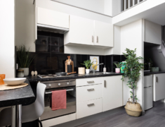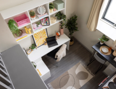 Studio房型是复式结构,楼上是床和书柜,楼下是全套的现代化厨房、卫浴和书桌。厨房配有冰箱、微波炉、吸尘器等基本厨房设备。部分房间带有一个或多个落地窗,采光极好。