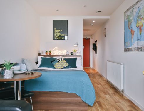 市中心步行 5 分钟直达!56 间宽敞单间套房,包全 bills + 保险,24 小时安保 + 专属自习室,公交 20 分钟到阿伯丁大学,拎包入住无琐事,学习逛吃两不耽误。