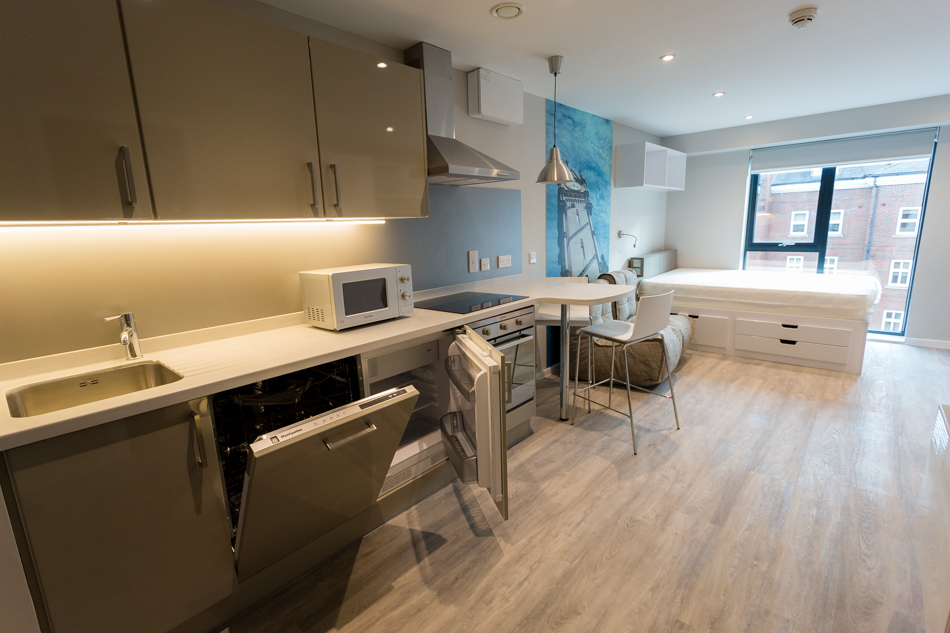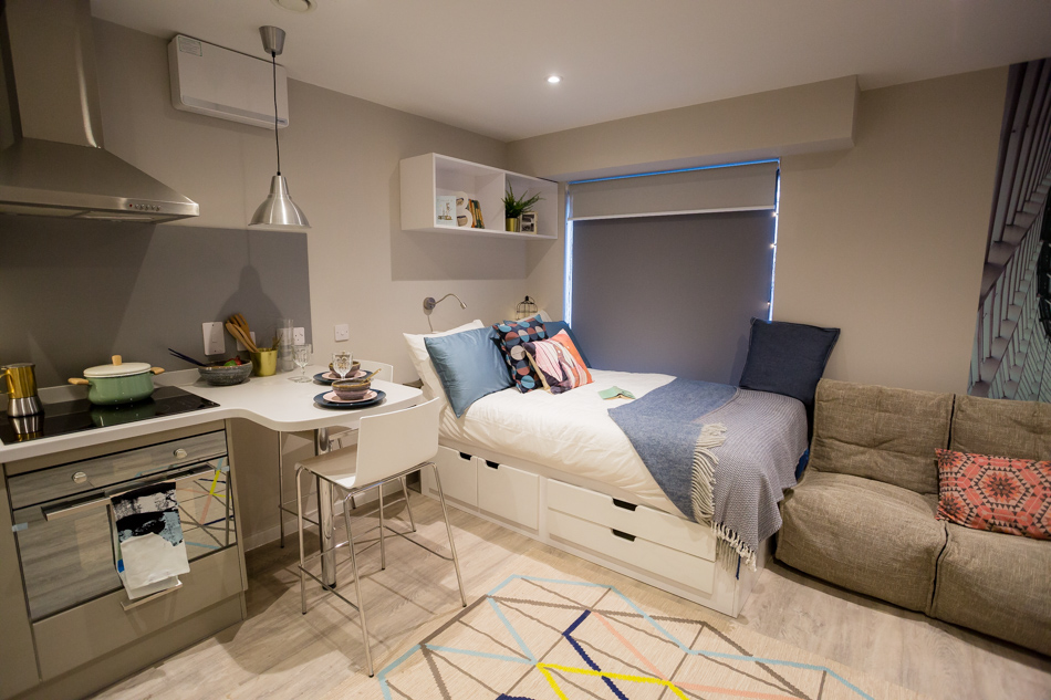 公寓是全Studio户型,房间配备了32寸智能电视,全套定制家具,懒人沙发,以及设施齐全的独立厨房,包含了电磁炉,烤箱,微波炉,冰箱,以及个别户型配备了洗碗机。空间布局合理,既能放下舒适床铺,又有独立学习区,赶 due 时不用迁就他人作息,完全享受 “小而美” 的独立生活,不管是独处还是专注学习,都能拥有理想环境。