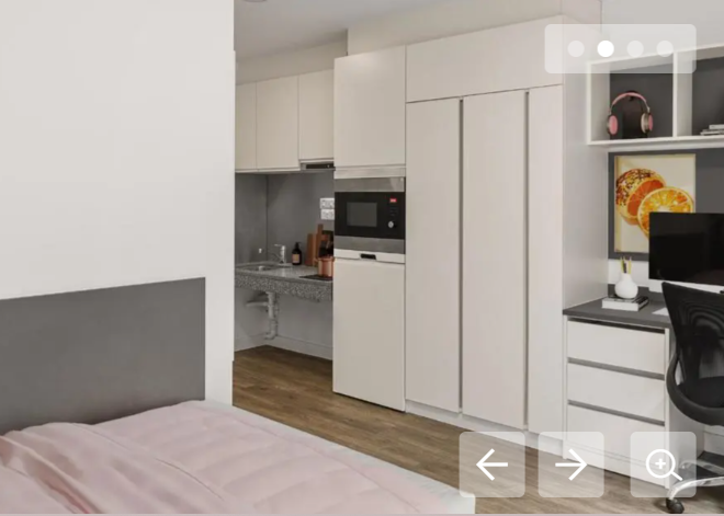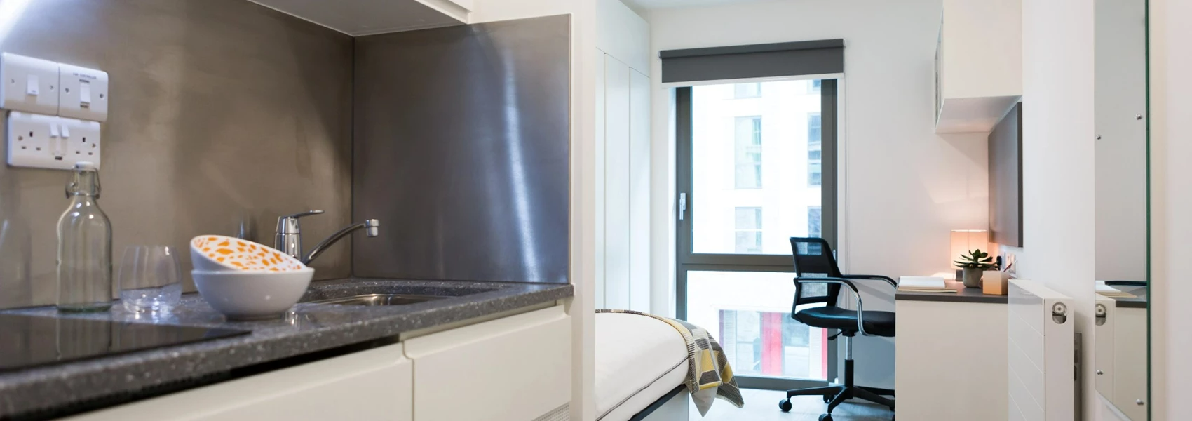 供不同楼层的ensuite套间,最多可容纳 5-6 人。套间配备独立卧室和浴室,并可使用公共厨房。如果喜欢完全独立的生活方式,也可以选择studio,它拥有独立的卧室、浴室和厨房。所有房间均配备一张小型双人床、学习空间和充足的储物空间。多功能厨房配备烤箱/微波炉、炉灶、冰箱/冰柜和抽油烟机。
