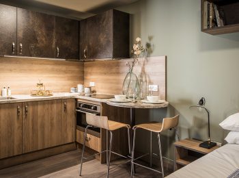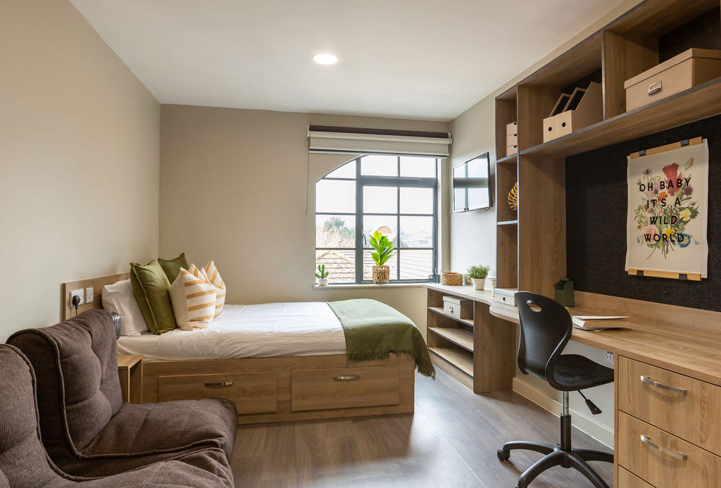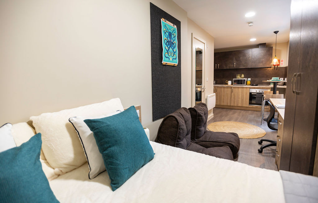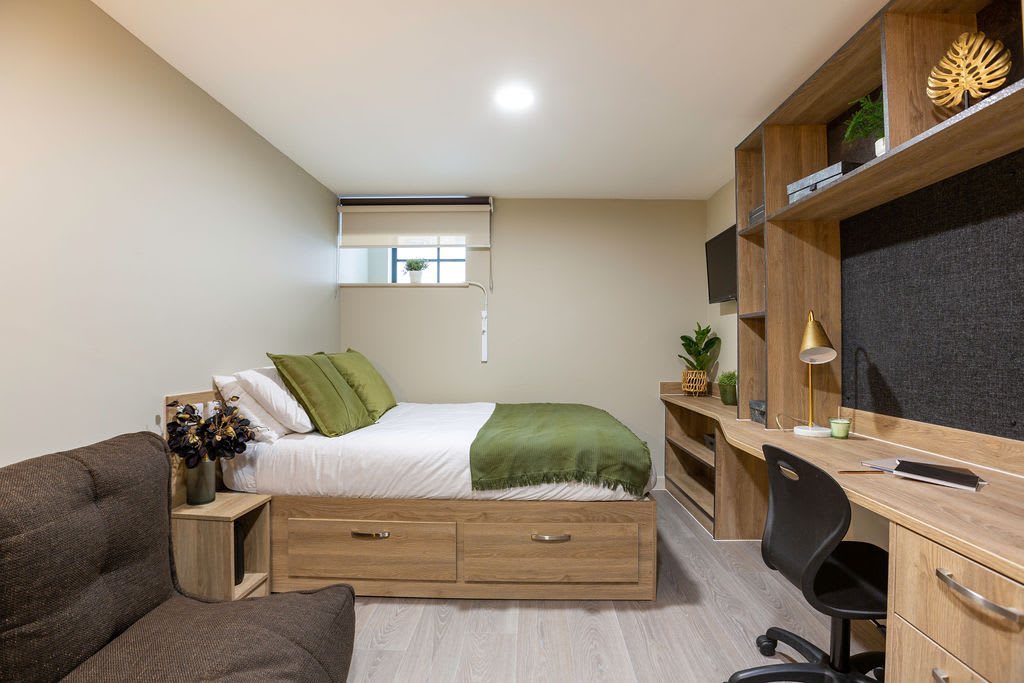每间Studio配备双人床、书桌、衣柜、32寸电视及独立厨房(含灶台、烤箱、冰箱、洗碗机与早餐台)。独立卫浴,暖气与网络全覆盖。