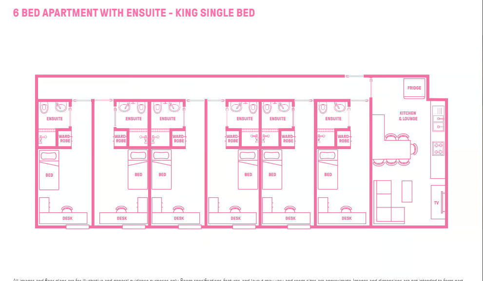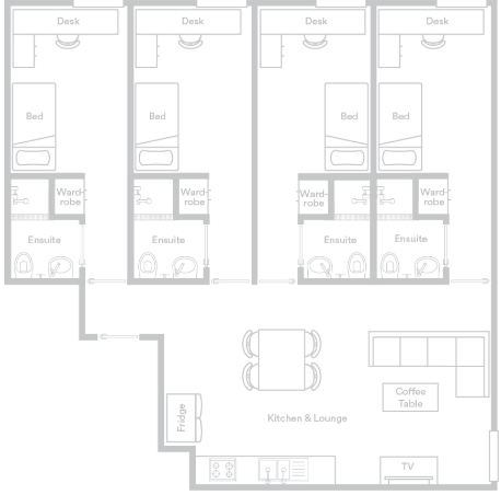 提供4 Bed Ensuite和6 Bed Ensuite两种房型,独立卫浴单人间,4-6人共享厨房。均配备舒适床垫、储物空间和充足采光。厨房含灶台、烤箱、冰箱,自在烹饪。