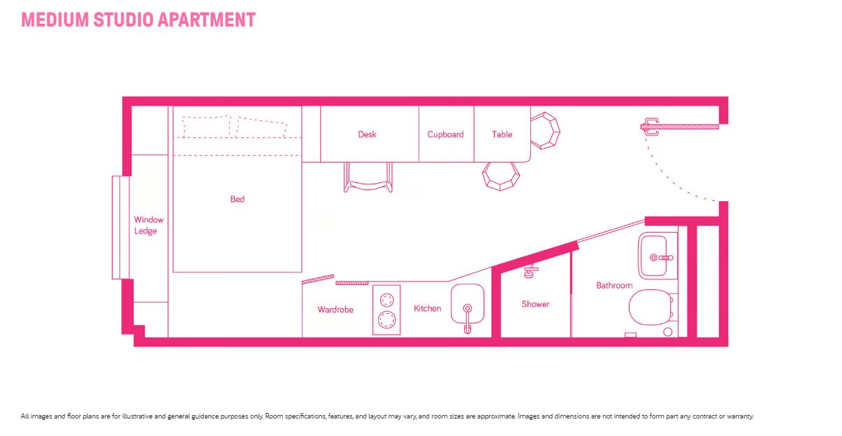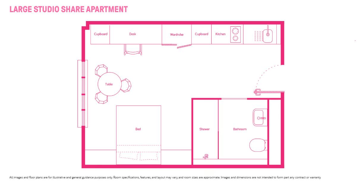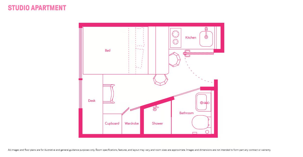 提供studio和2b share两种房型,studio独立卫浴单人间,配备单独厨房;2b share房型单人间,两人共享卫浴和厨房,适合好朋友一起居住。均配备舒适床垫、储物空间和充足采光。