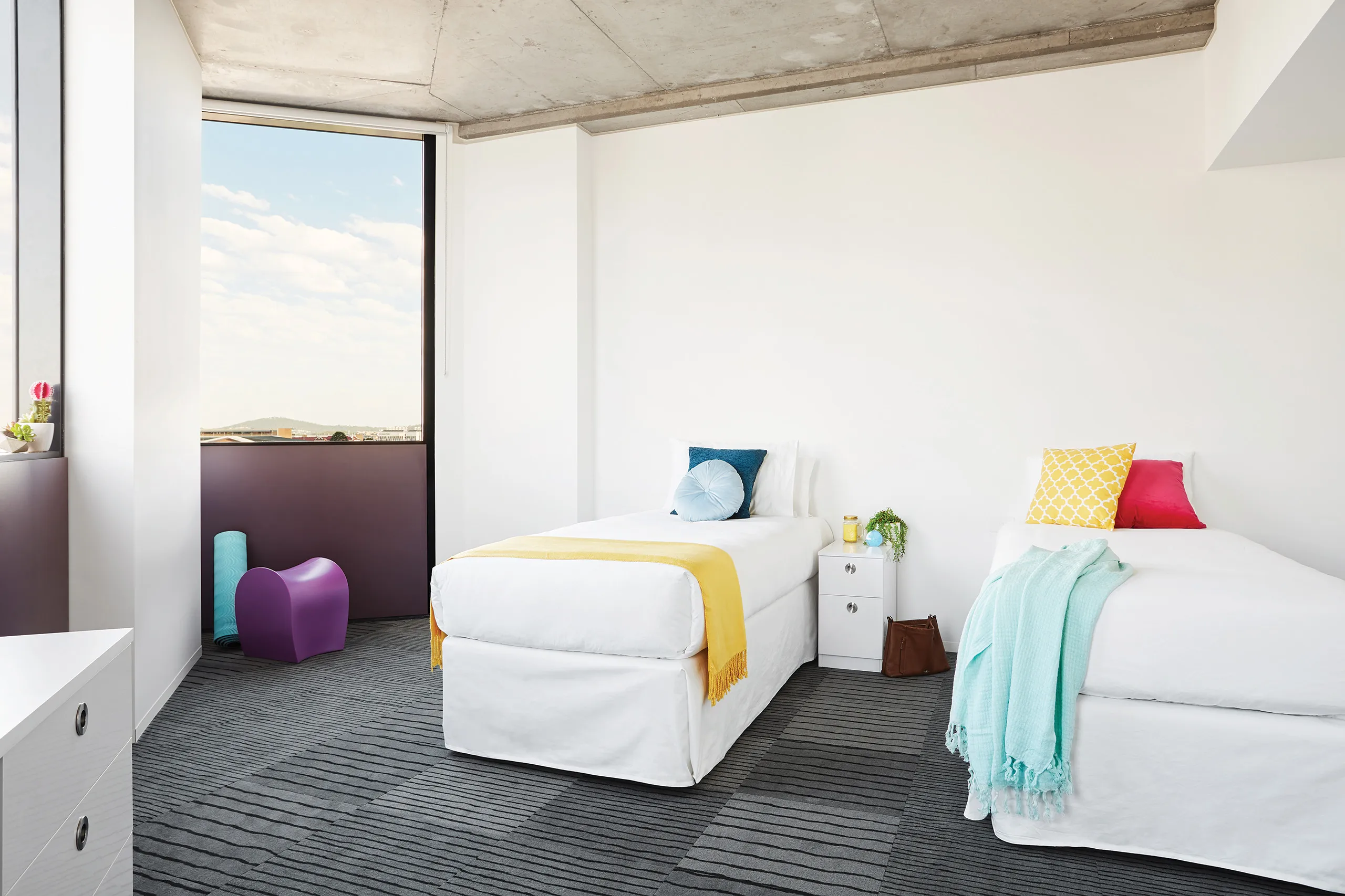 房间内部空间舒适,Studio15m²—23m² 约 ,ensuite 约12 ㎡,多人间人均空间宽敞不拥挤。床型为标准单人床,窗户可自由开启通风,配备冷暖空调,适配布里斯班气候,房间内家具家电齐全,含书桌、衣柜、冰箱、微波炉、电磁炉等,部分房型带独立洗衣机,拎包即住。