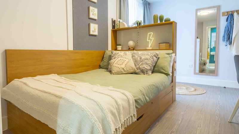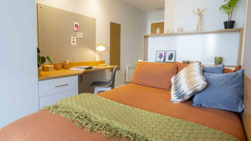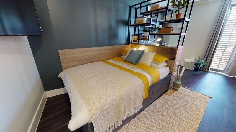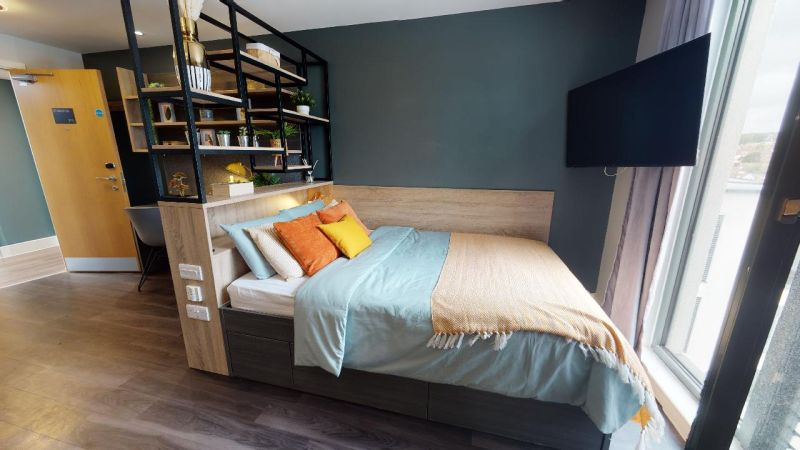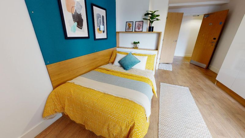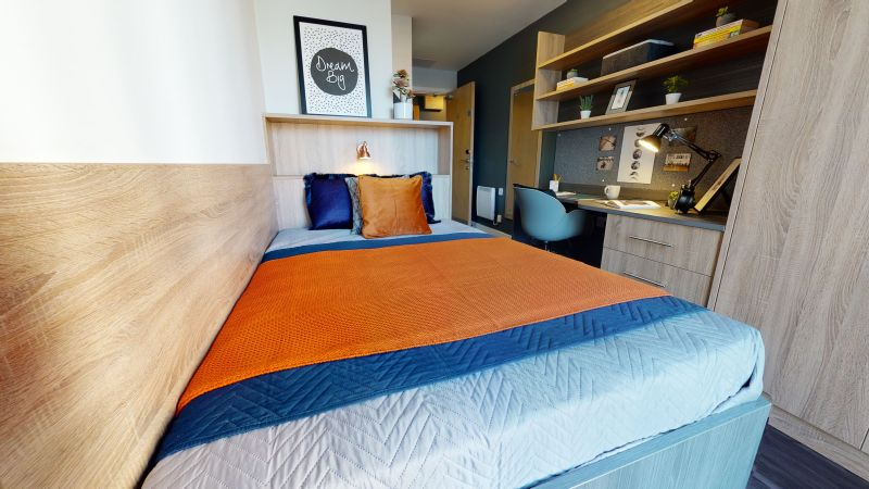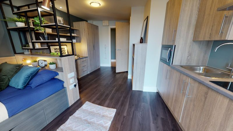 ensuite 房型为 self-contained flat,通常包含 3–5 间卧室,每间卧室配有独立卫浴、小双人床、书桌和储物空间,flat 内有共享厨房和客厅,适合希望在共享环境中生活的学生。studio 套房为私人房型,包含独立厨房、卫浴和起居空间,适合希望独立生活、自己做饭的学生。所有房间均配备基础家具和高速无线网络,租金包含水、电、暖气和网络费用。公寓内提供公共洗衣设施,便于日常生活。房间光线充足,通风良好,设计考虑学生学习和休息需求,部分房型可俯瞰城市景观。