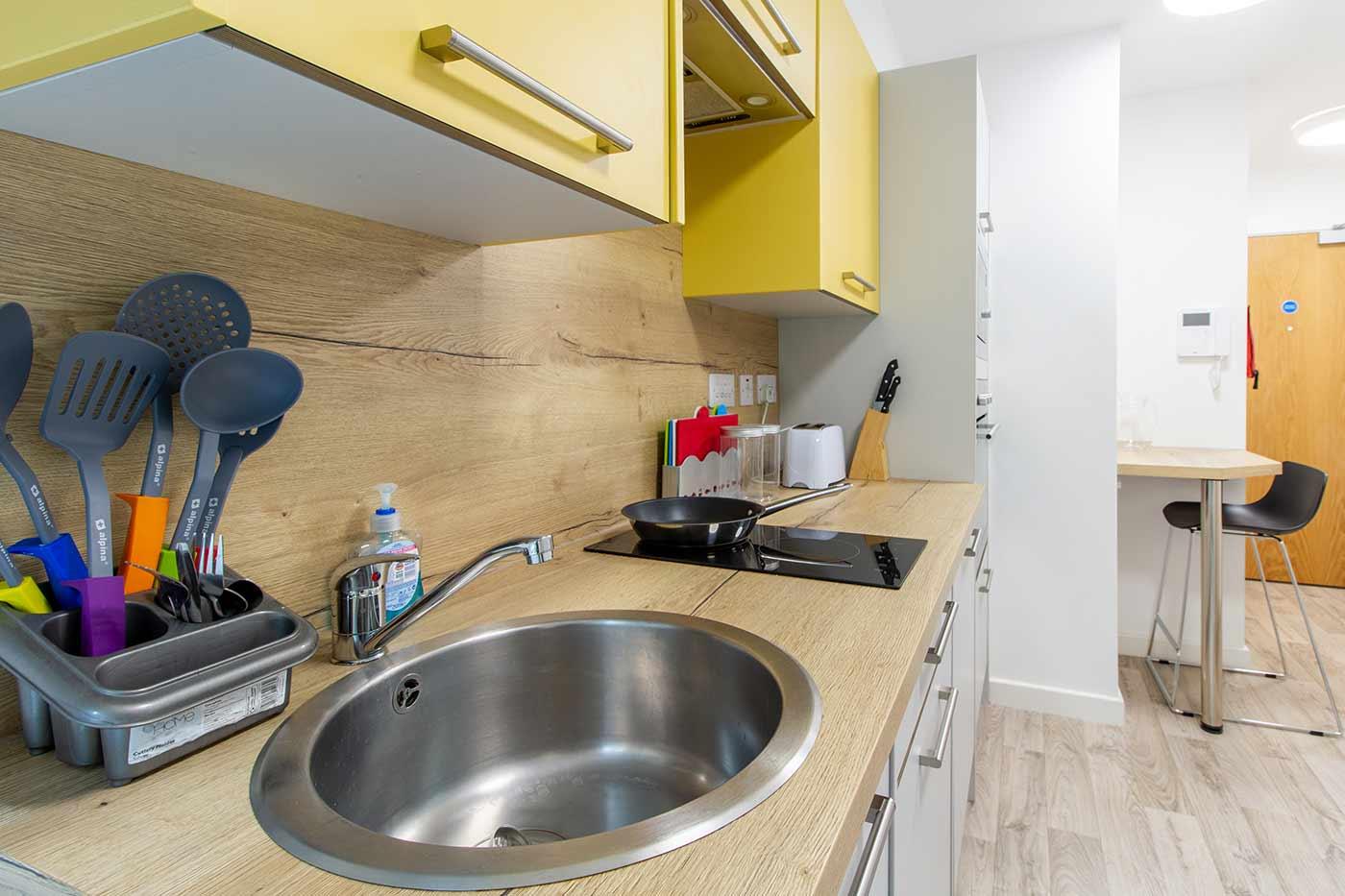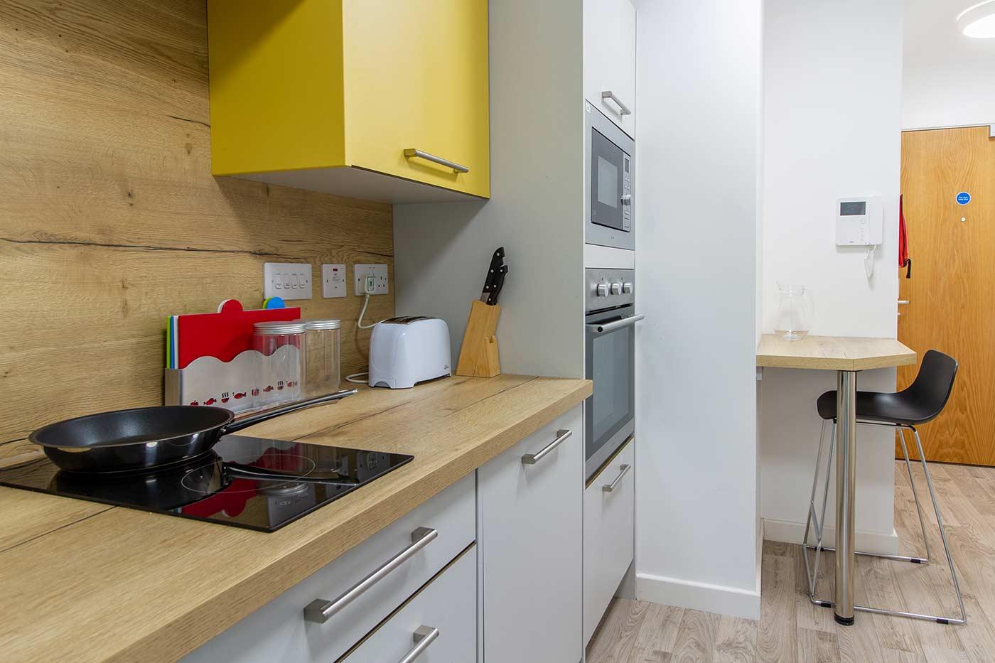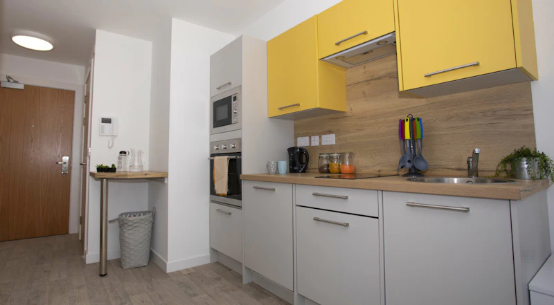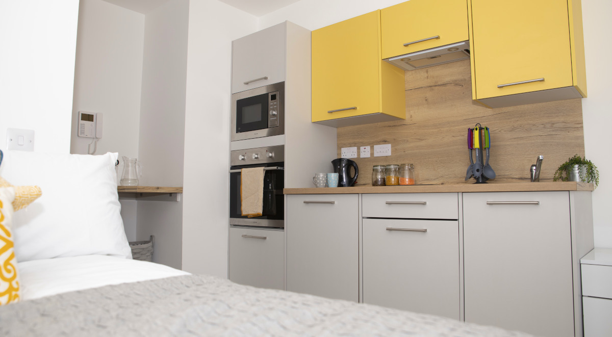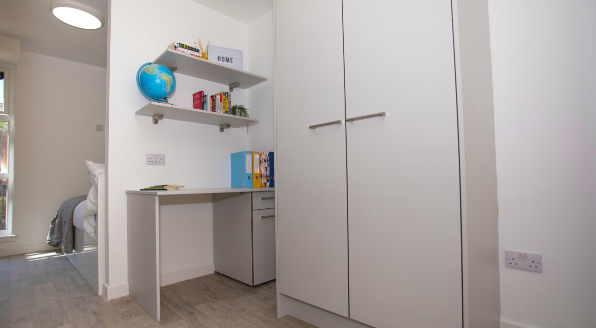 公寓提供2b Ensuite和Studio 房型。2b ensuite 房型独立卫浴、共用厨房,是喜欢社交的学生的最佳选择;Studio房型独立卫浴、独立厨房,为学生提供更私密和自在的个人空间。 房间配有双人床、书桌椅、衣柜、穿衣镜等,有充足的储物空间。厨房配有灶台、冰箱、烤箱等。