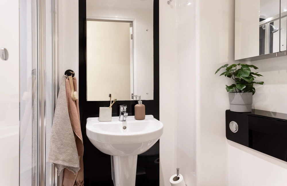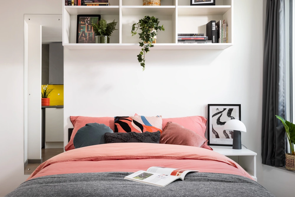公寓提供Ensuite和Studio 房型。ensuite 房型独立卫浴、共用厨房,一般是4-10人间,是喜欢社交的学生的最佳选择;Studio房型独立卫浴、独立厨房,为学生提供更私密和自在的个人空间 。房间有大落地窗,采光好,配有双人床、书桌椅、衣柜等,有充足的储物空间。厨房配有灶台、冰箱、烤箱等。