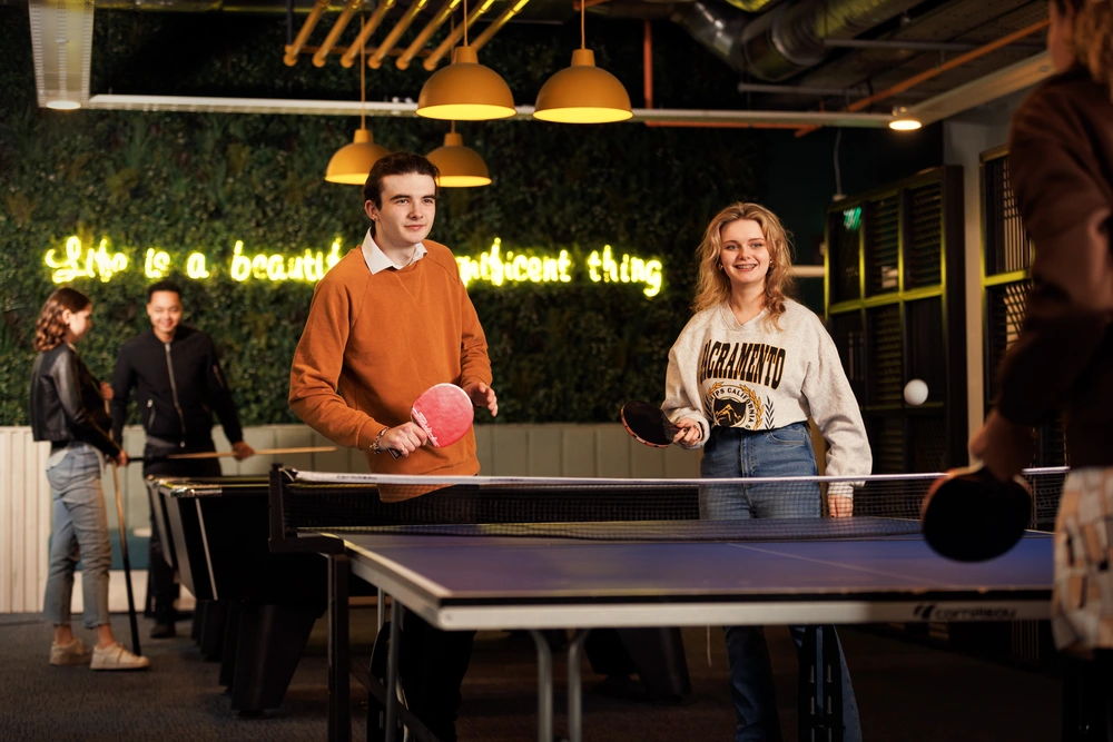 公寓设施比较齐全,公寓有学习室、游戏室(乒乓球桌、台球桌)、电影放映室、高空休息室、屋顶露台、公共厨房、洗衣房,满足同学们学习、休闲、社交的需求;配有前台、24小时安保、24小时监控,安全感满满~