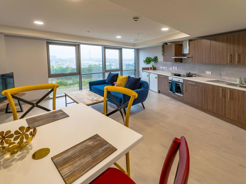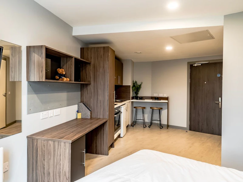 公寓提供En-suite(3-6人间)与Studio(独立厨卫) 两种主流房型,提供200Mb免费WiFi, 所有水电费和暖气费以及室内物品保险费都包含在租金以内,24小时前台代收包裹,定期房间清洁(可选),安全门禁系统,24小时健身房,影音游戏室,麻将桌,卡拉OK。
