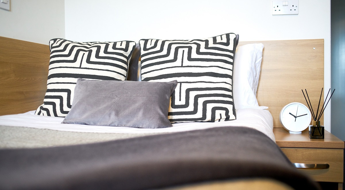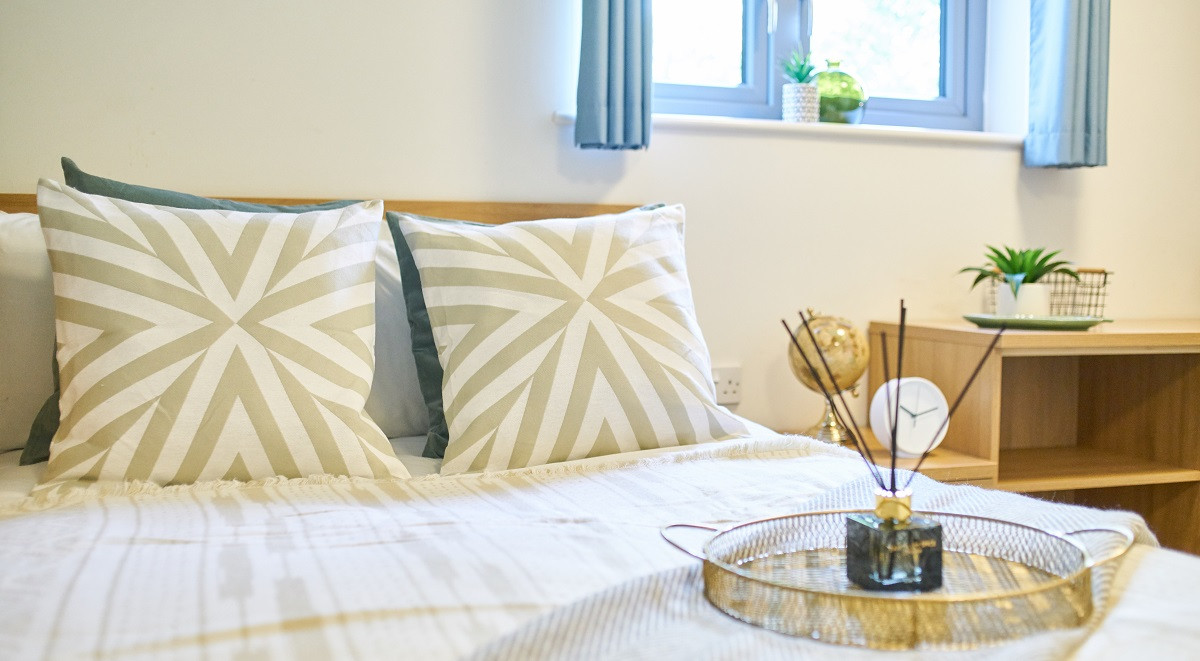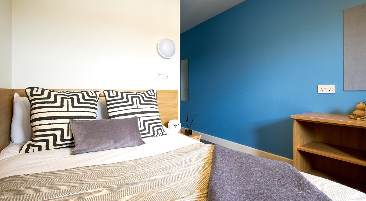 公寓提供3种 Ensuite房型。ensuite 房型独立卫浴、共用厨房, 一般是5人间,是喜欢社交的学生的最佳选择。每个flat公共厨房都有独立的洗衣机,使用方便卫生,房间配有双人床、书桌椅、衣柜、穿衣镜等,有充足的储物空间。厨房配有灶台、冰箱、微波炉、烤箱等。公寓设施比较齐全,公寓有学习室、公共休息室、庭院、游戏室、洗衣房等,公寓定期会举办活动,满足同学们学习、休闲、社交的需求;有前台、24小时监控、安保和门禁系统,安全感满满。