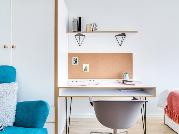 房间配大床、学习区与充足储物空间,Ensuite共享现代厨房,Studio自带迷你厨房。全套家具与厨房用品齐全,拎包即住。