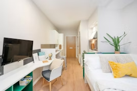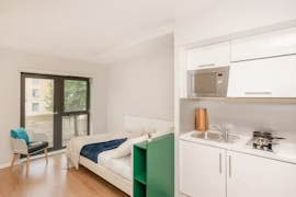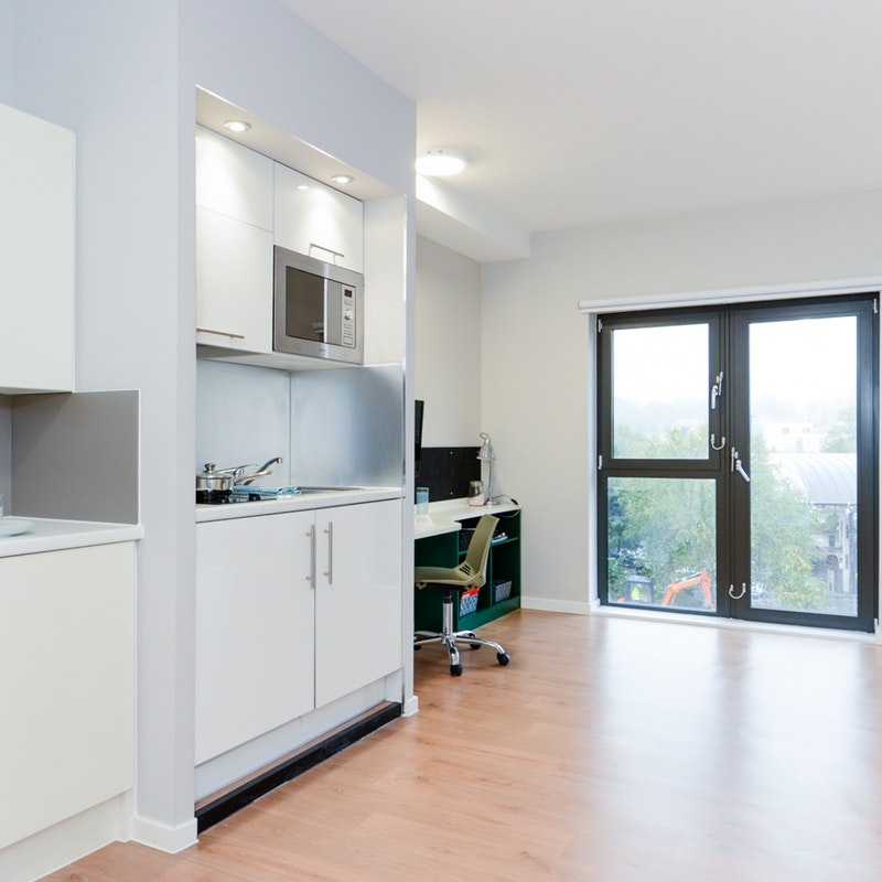 房间内部:提供Studio房型,提供全套的现代化厨房、卫浴和书桌,厨房配有冰箱、微波炉、吸尘器等基本厨房设备。部分房间带有一个或多个落地窗,采光极好。
