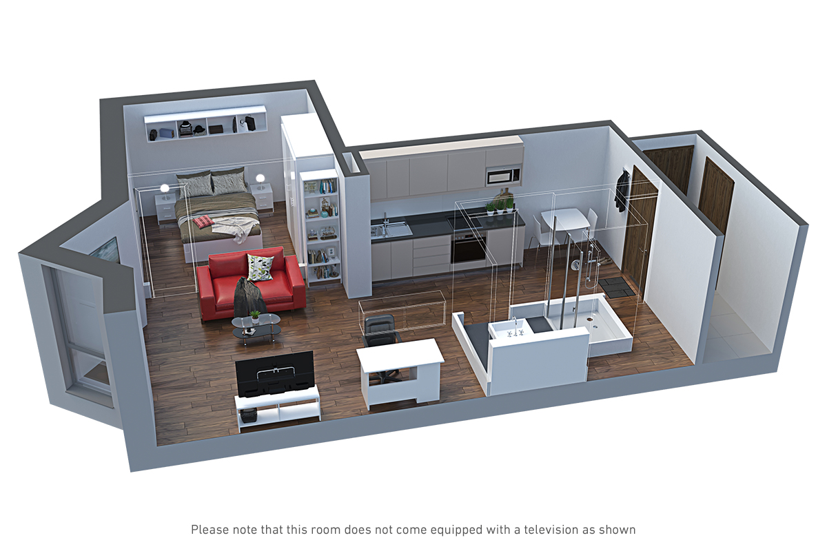 主打Studio与一居室户型,最大45㎡空间配备独立厨卫、舒适床型及全景采光窗。定制书桌与储物系统,厨房含烤箱/冰箱等全套设备,实现高品质独居。