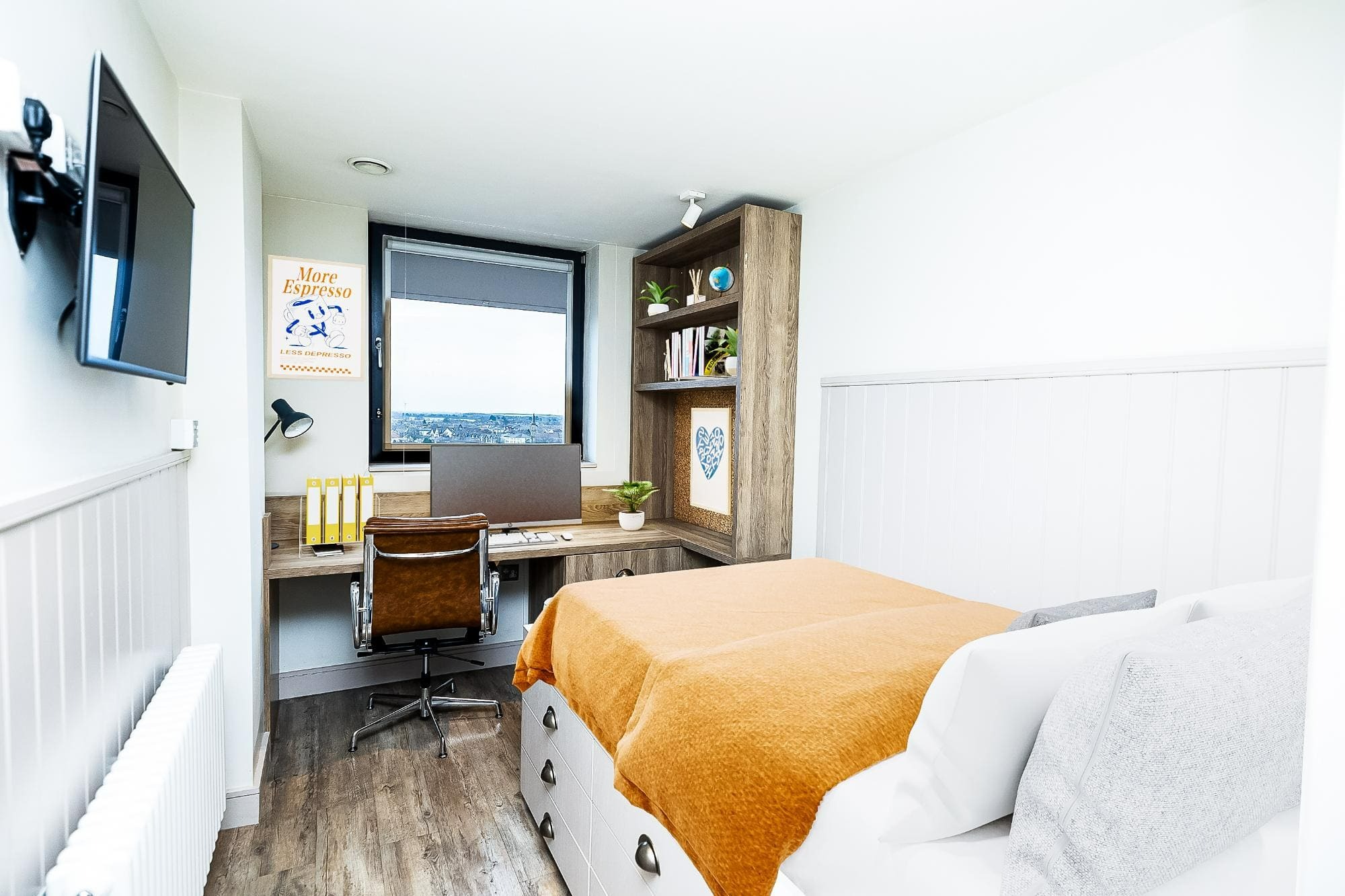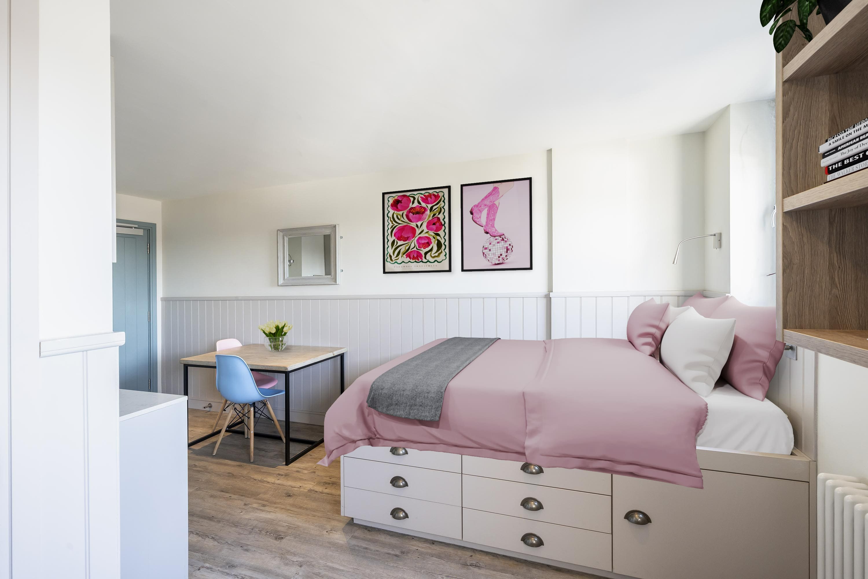 涵盖En-suite与Studio等房型,En-suite为独立卫浴单间(多人共享厨房),Studio为独厨独卫套房,面积14-22平米。房间配家具、床及厨房用品,暖气充足,24小时热水,窗户可正常开启,通风采光佳。