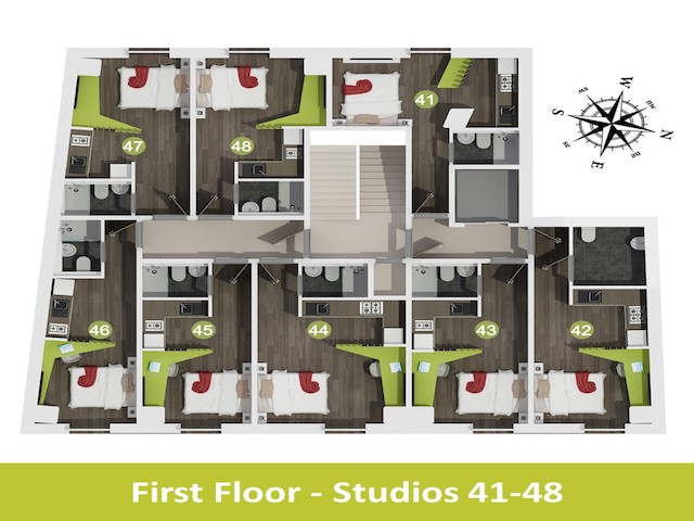 房间内部:所有房间均为独立Studio,自带独立卫浴与厨房,隐私性拉满。配备舒适床具、宽敞书桌及充足储物空间,兼顾休息与学习;厨房用品齐全,24小时热水供应,暖气充足,不管做饭还是洗漱都舒心。