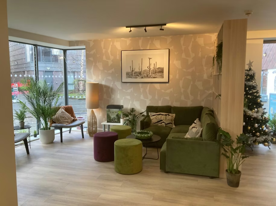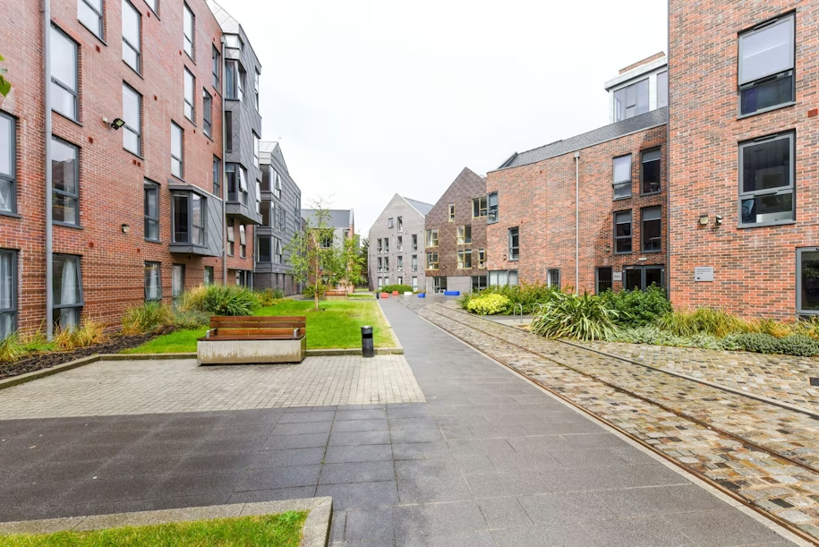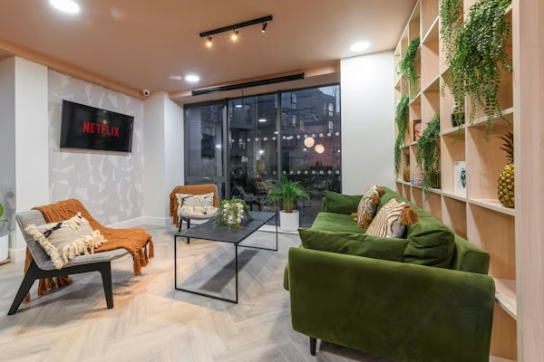 24 小时门禁(钥匙卡通行)+ 全区域 CCTV 监控,居住安全有保障。前台提供 代收快递服务,驻场经理与维修团队响应及时,快速解决生活问题。公共区域功能丰富:24 小时自习区配备桌椅与充电接口;社交休息室设有台球桌、桌上足球与电视,户外还有专属庭院;另有带烘干功能的洗衣房、电梯、自行车库及自动售货机。公寓定期组织主题社交活动,住户多为切斯特大学学生,新生易快速融入集体。