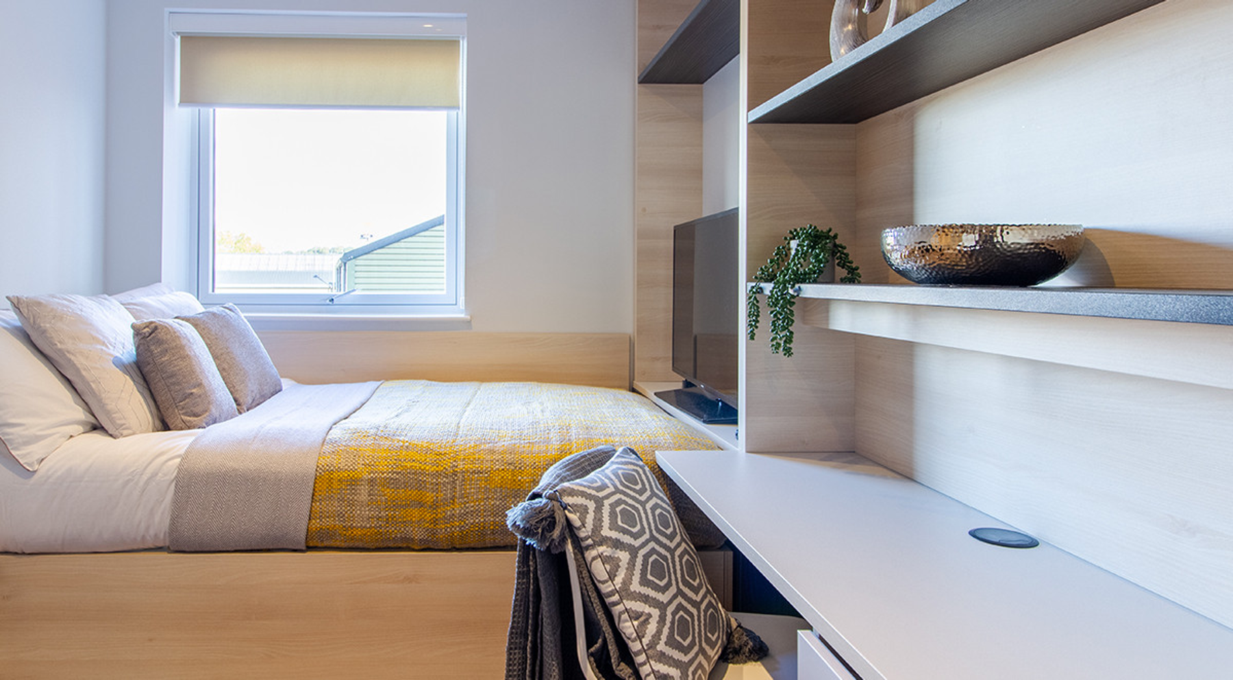 房间内部空间宽敞,挑高的天花板和大型窗户是其显著特色,带来充足的自然光线。房间内配备舒适的双人床、实用的学习区和充足的储物空间,同时配备了高效的空调,无论冬夏都能享受恒温舒适。