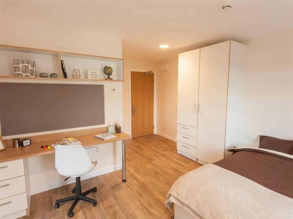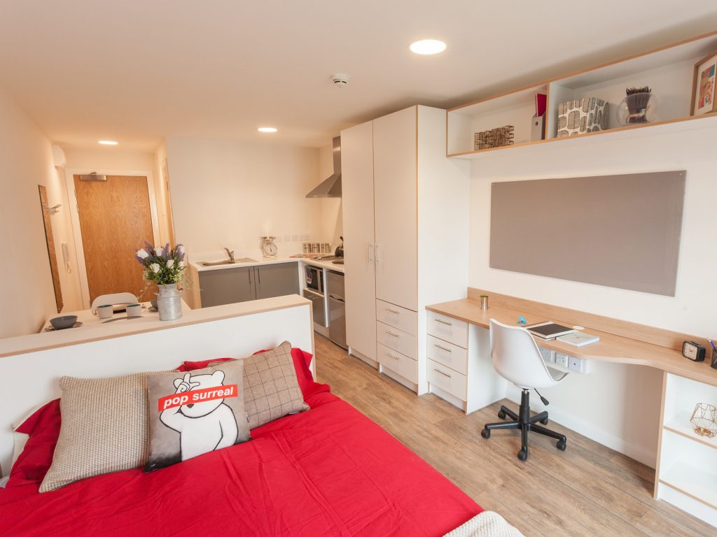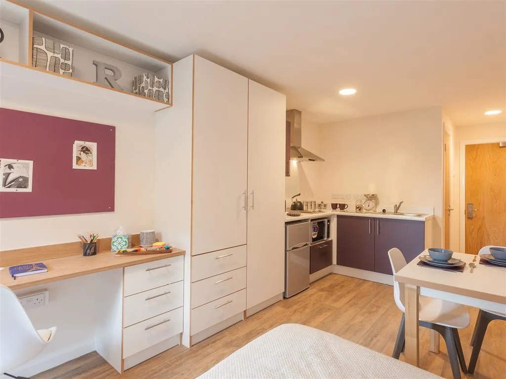 公寓主要提供En-suite(4-6人共享厨房)和Studio房型。每间卧室配备舒适双人床、超大书桌和可开启窗户,保证自然通风采光,还提供免费WiFi, 所有水电费和暖气费都包含在租金以内,24小时安全门禁,安保人员,24小时监控,24小时热水,全套家具,洗衣房,电梯,维修团队,娱乐区,电影放映室,健身房,自习室,自行车库,停车位。