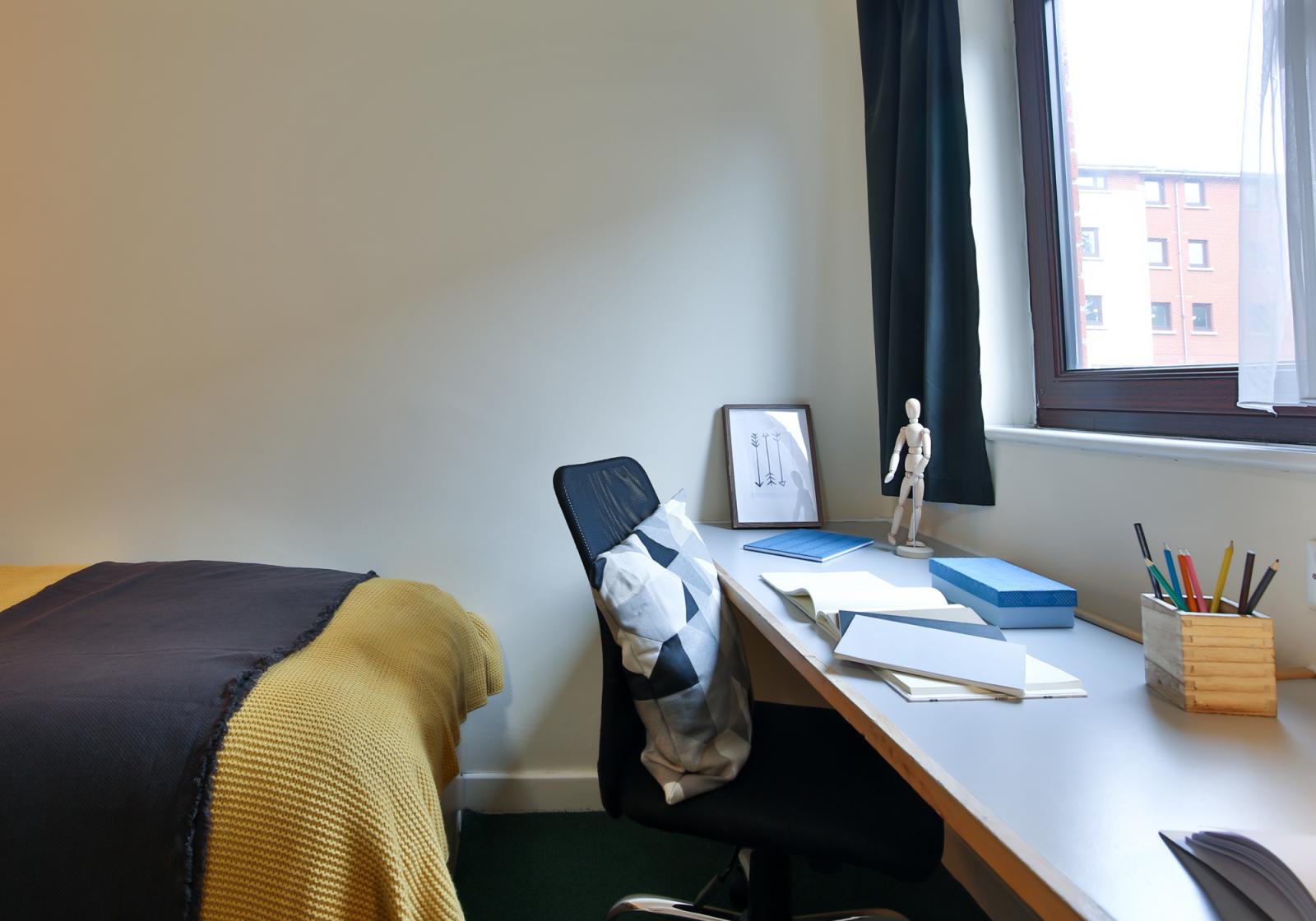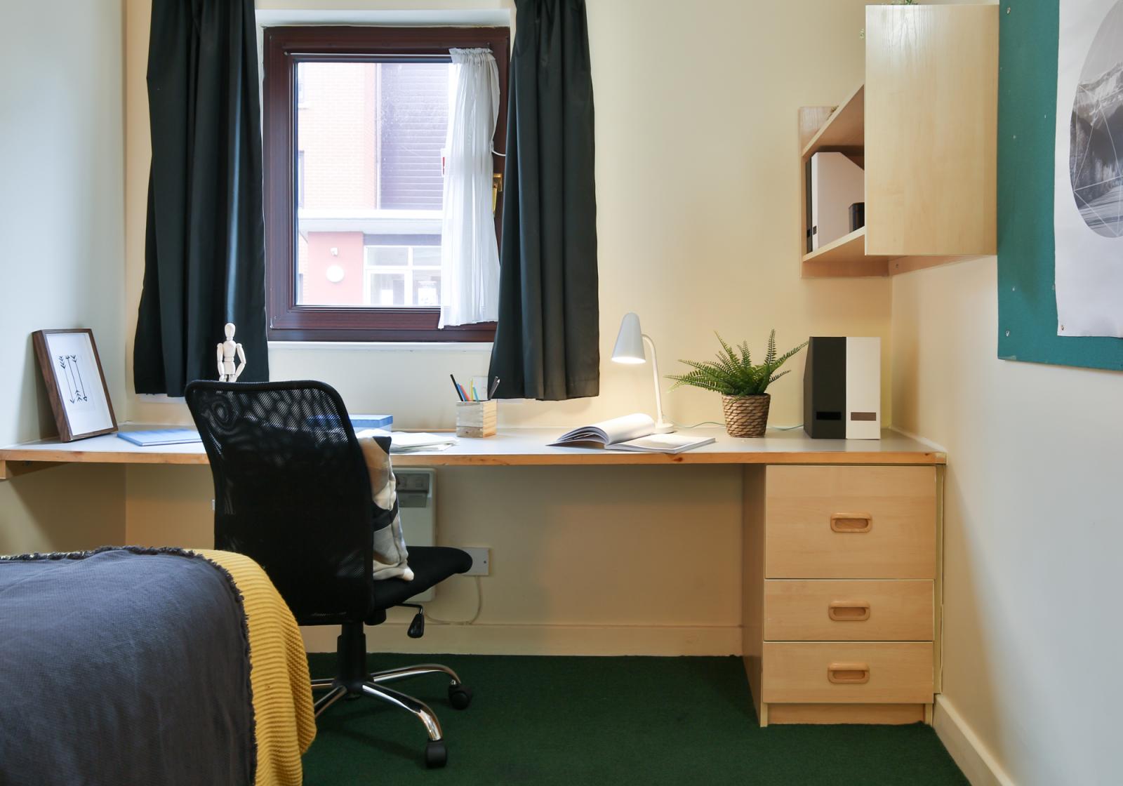 - Daisy Bank 主要提供 En-suite(独立卫浴,共享厨房)房型,同时也提供适合朋友或情侣入住的两室公寓;租金已包含水费、电费、暖气费、网络费及财产保险,卧室内配备了书桌、椅子、衣柜、储物空间和书架,为你营造了舒适的学习与休息环境。