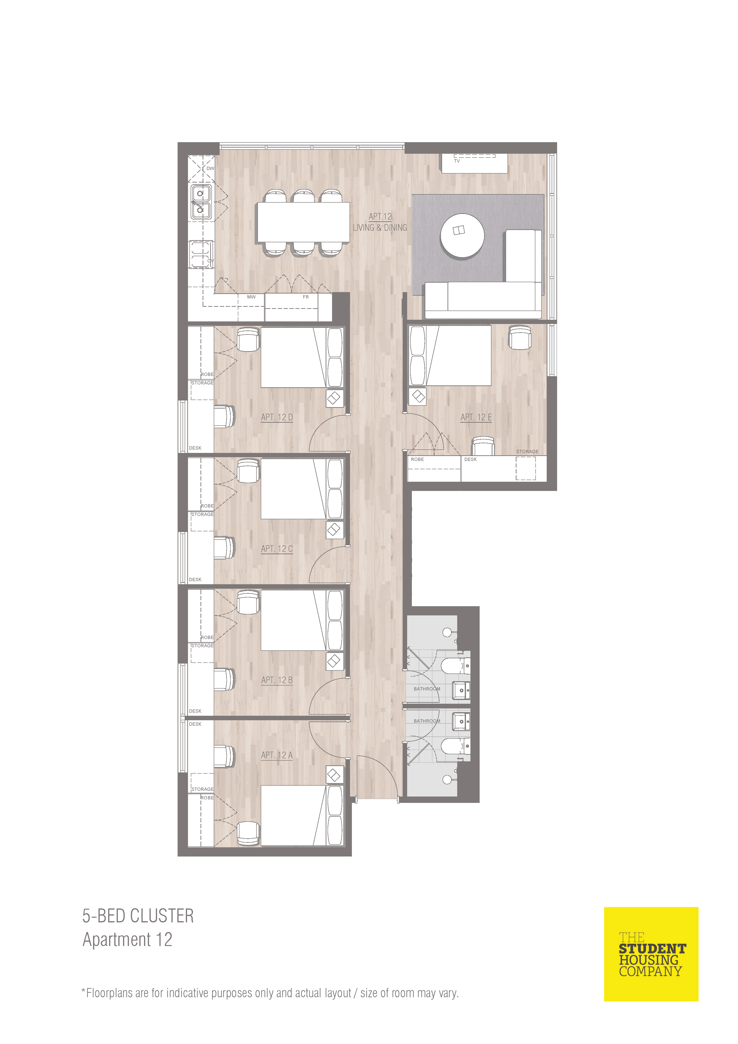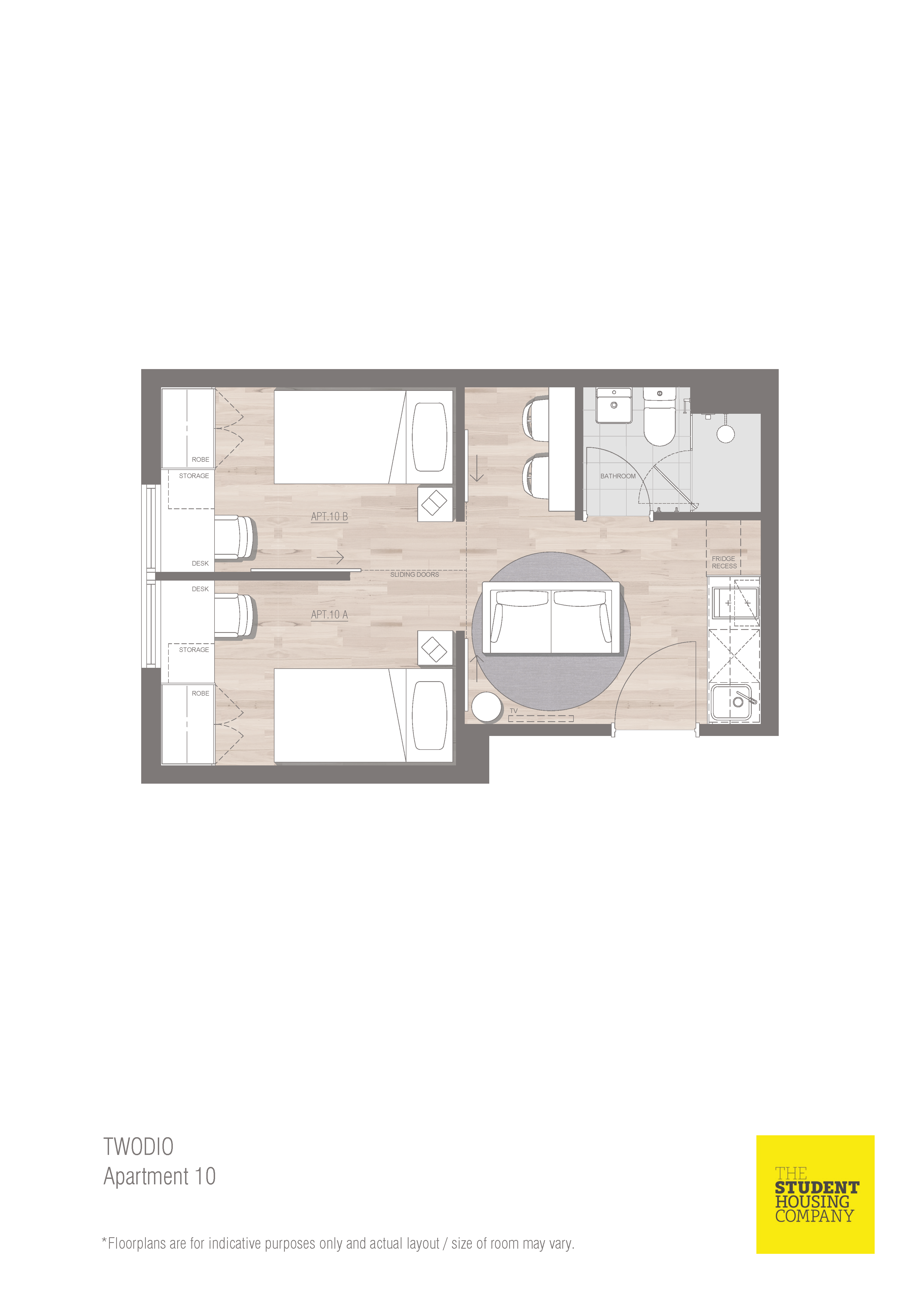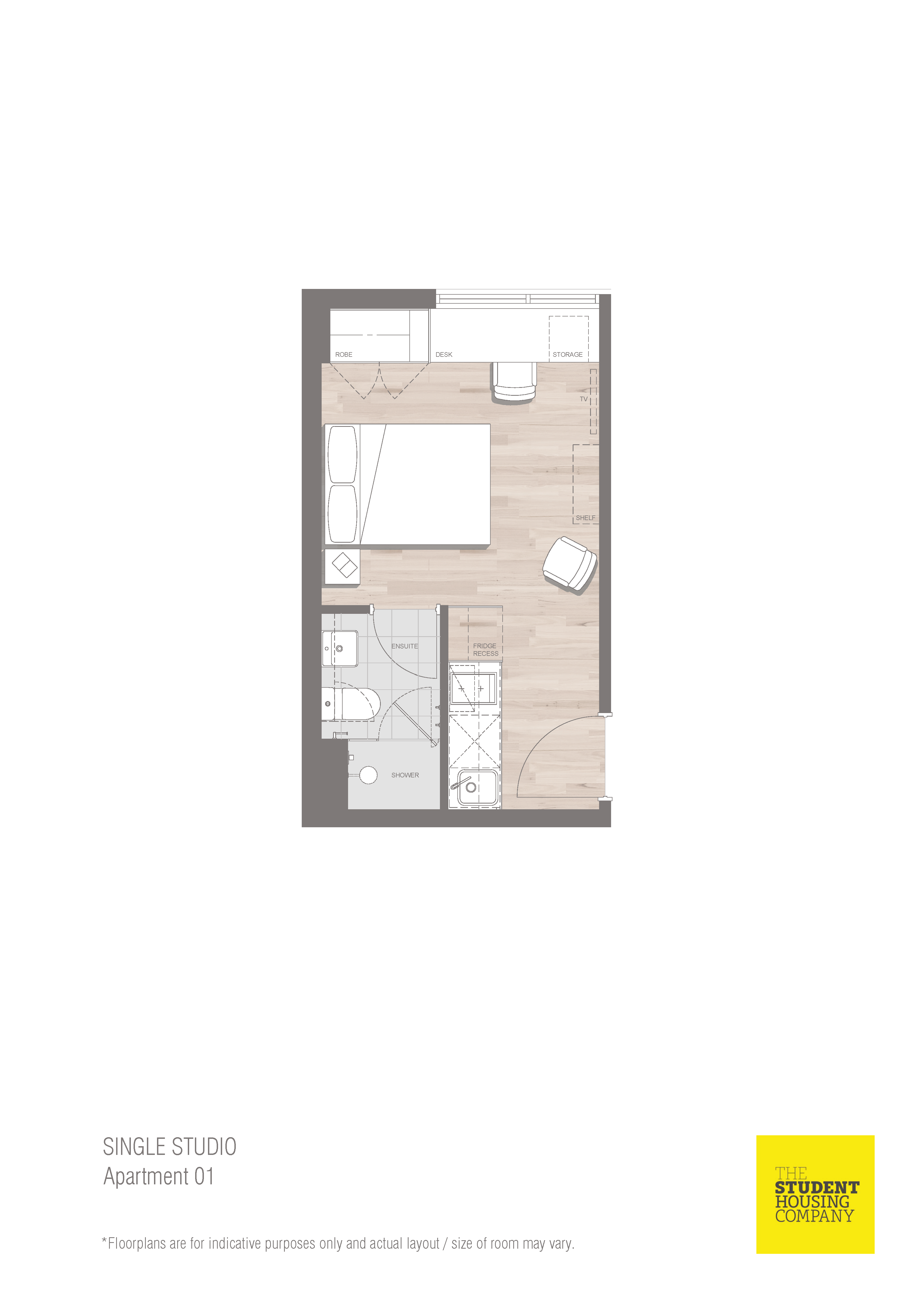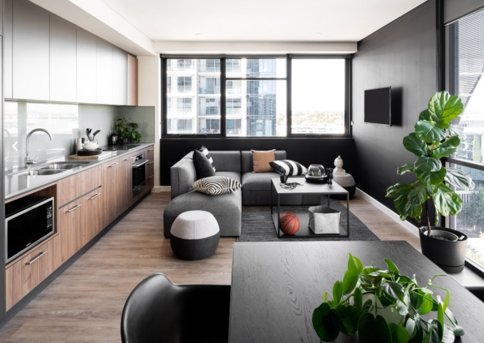 房间内部布局实用,Studio 约 18㎡,Twin Studio 约 27㎡,5-6 人共享公寓人均空间宽敞。床型为标准单人床(Twin Studio 含两张单人床),窗户可自由开启通风,配备空调,适配珀斯气候。房间内家具家电齐全,含书桌、衣柜、冰箱、厨具等,拎包即住。