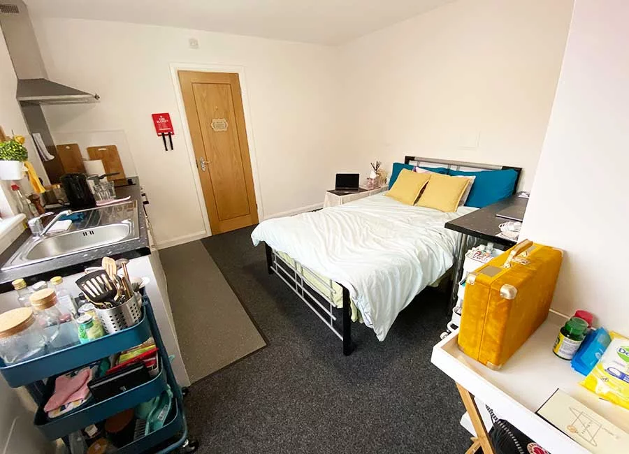 周边是成熟生活区,治安口碑好,深夜回公寓也踏实。步行5分钟到市中心商圈,1km内可达Tesco Extra超市,外卖平台上中餐馆选择丰富,火锅、炒饭随点随到。临近社区公园,课后散步或周末放松都合适,学习与生活节奏超舒服!