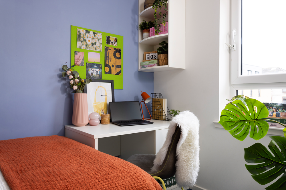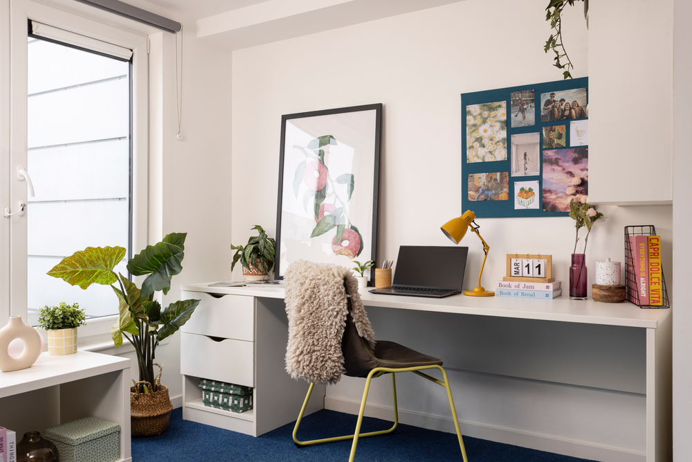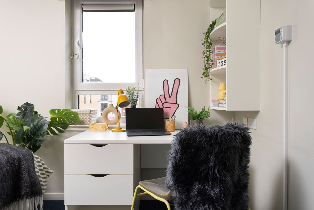 房型有 12-15㎡单人 studio 和 2 人合租套房,空间比同价位公寓宽敞些。配 1.35m 双人床,翻身不挤;窗户能打开,夏天吹自然风很舒服;暖气是智能调控的,冬天能自己调温度,不怕冷也不怕热。每个房间都有独立卫浴和大书桌,写论文、放电脑超够用,社恐同学也能自在住。