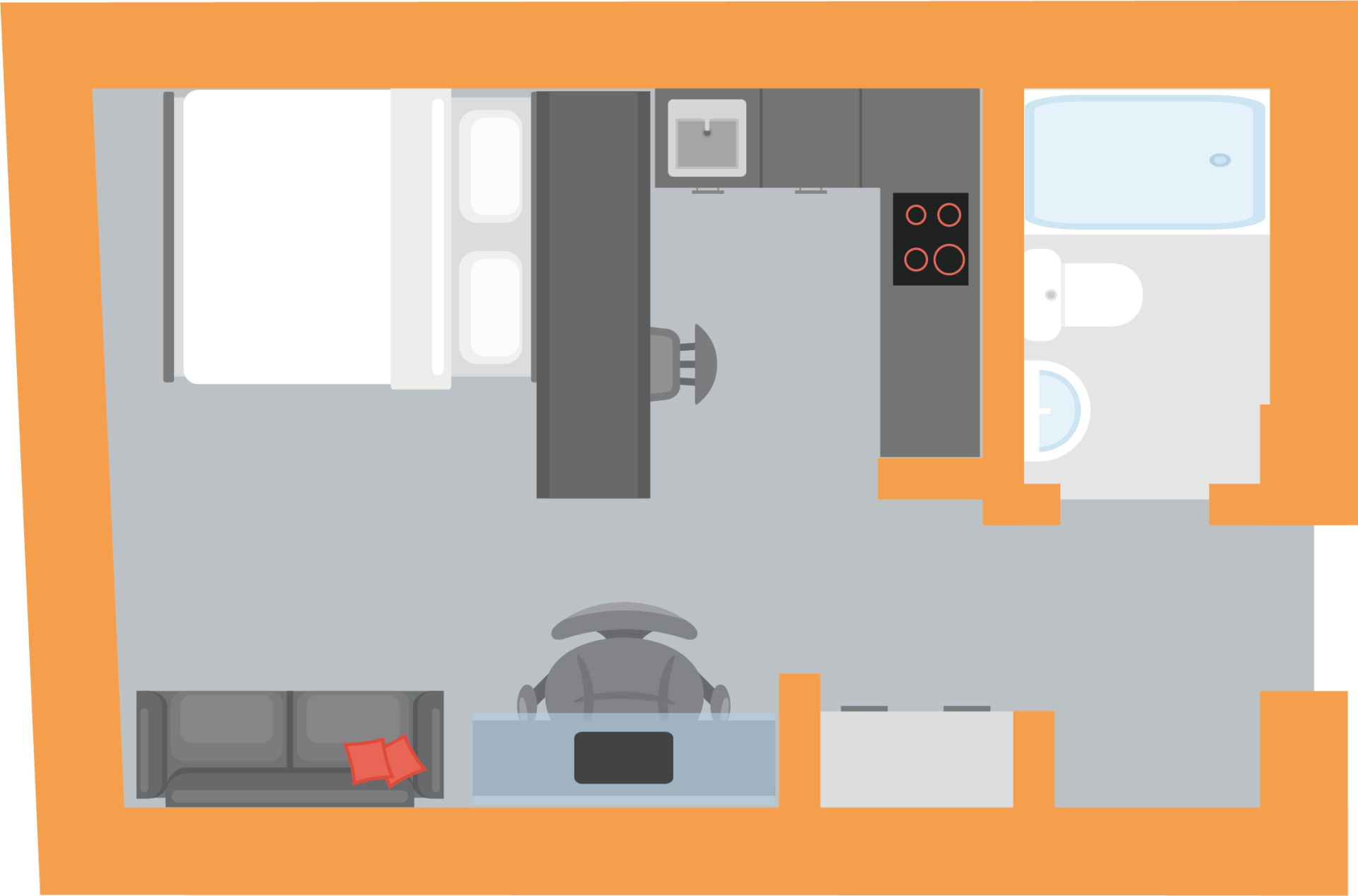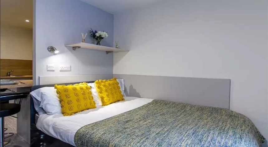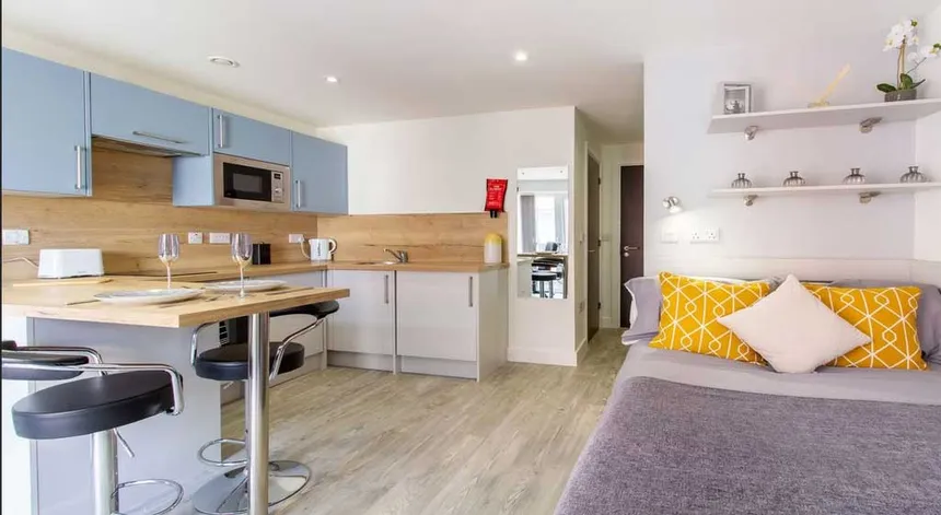 Studio(单间公寓):自带独立卫浴与独立厨房,还配备平板电视,适合偏爱独居、重视生活自主性的学生,日常起居、烹饪、休闲全在独立空间内完成,不用迁就他人作息;