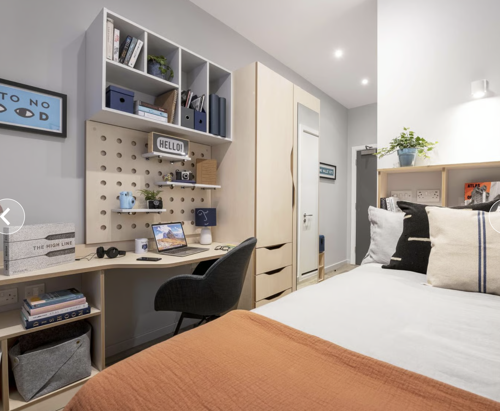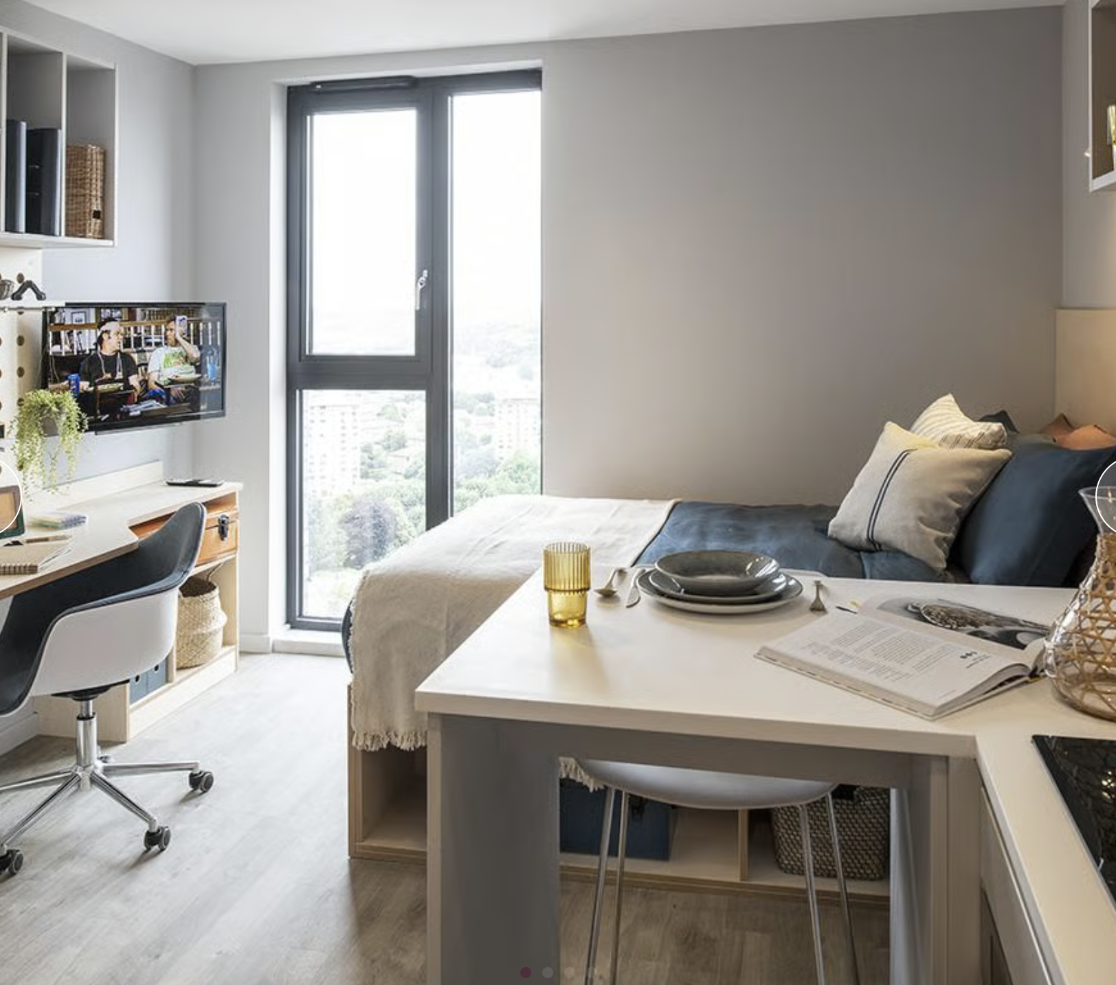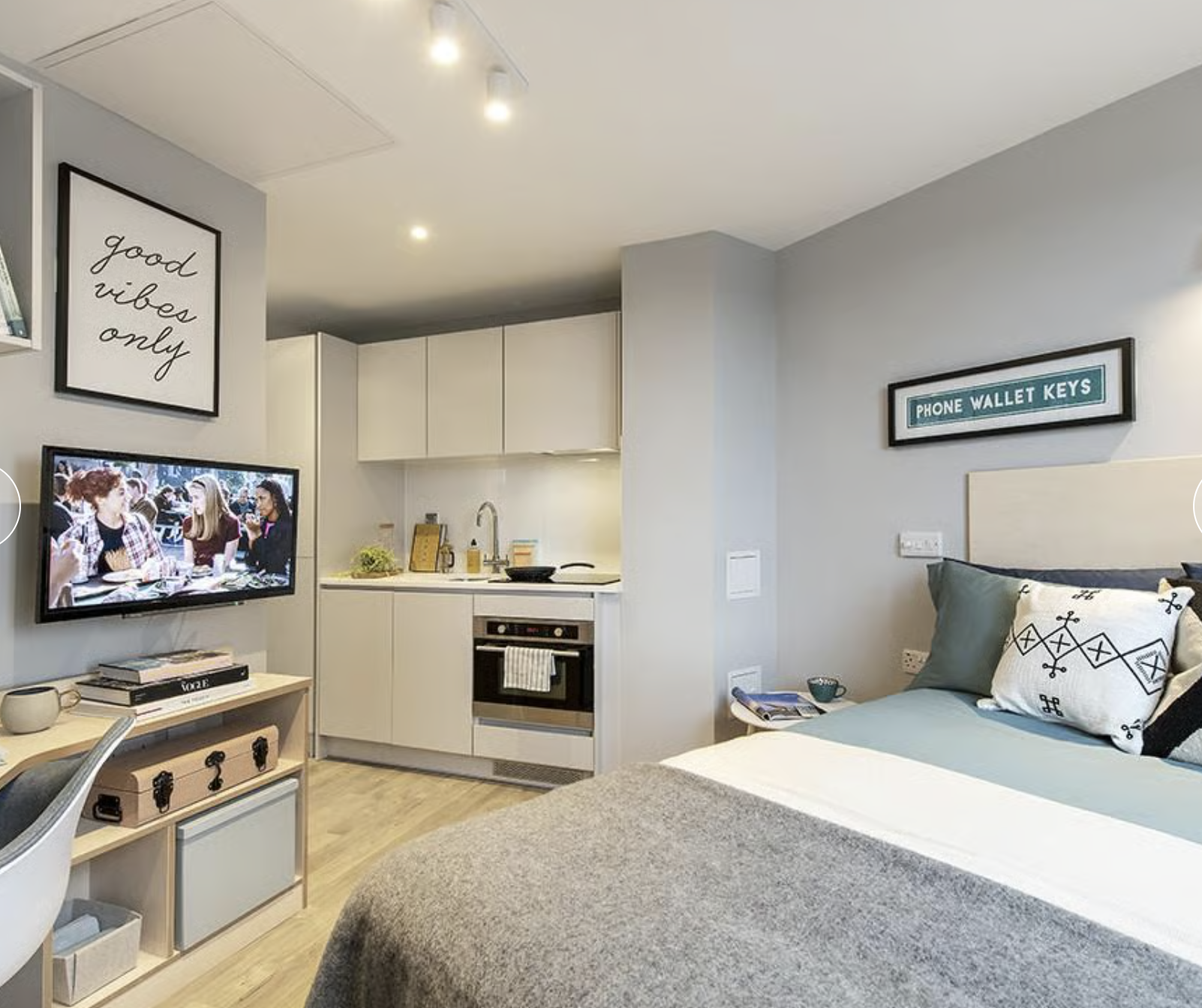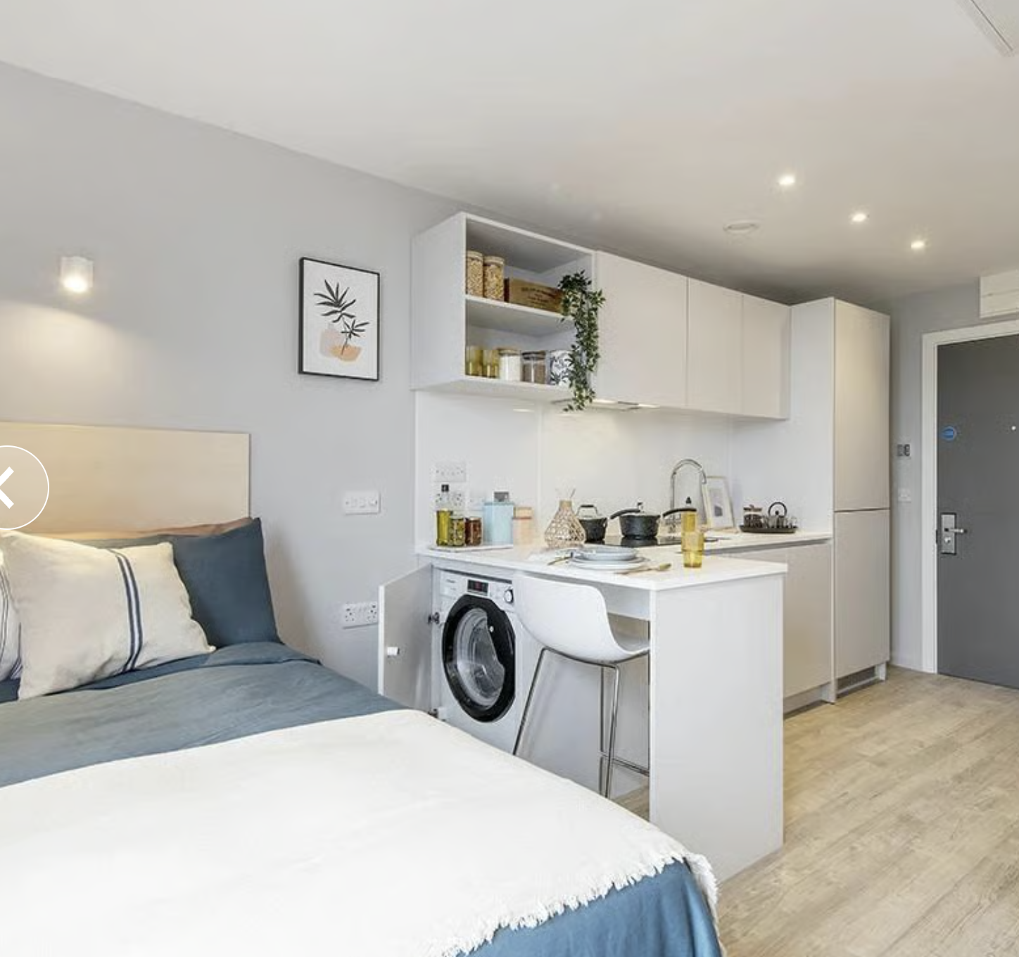 Studio房型:大面积独立天地,独立卫浴+独立厨房,配备洗衣机、烤箱、冰箱等齐全家电,做饭便捷无油烟。部分房型带落地窗,景观绝佳,双人床柔软舒适,衣柜、储物柜等收纳空间充足,居住体验拉满。
