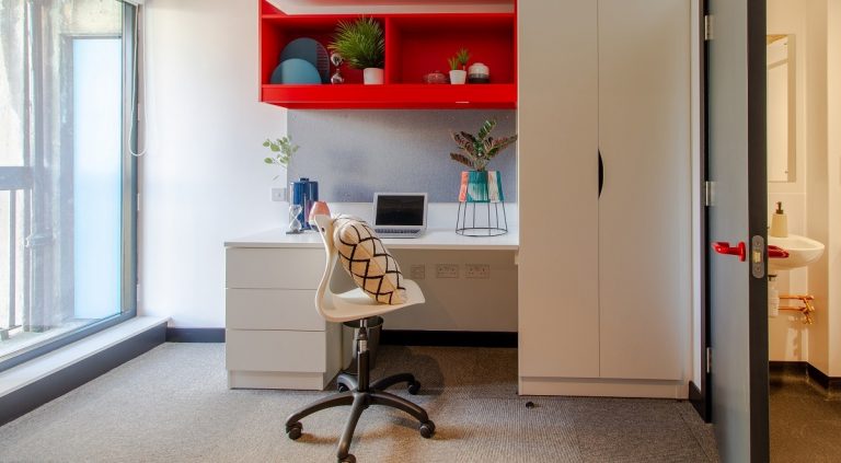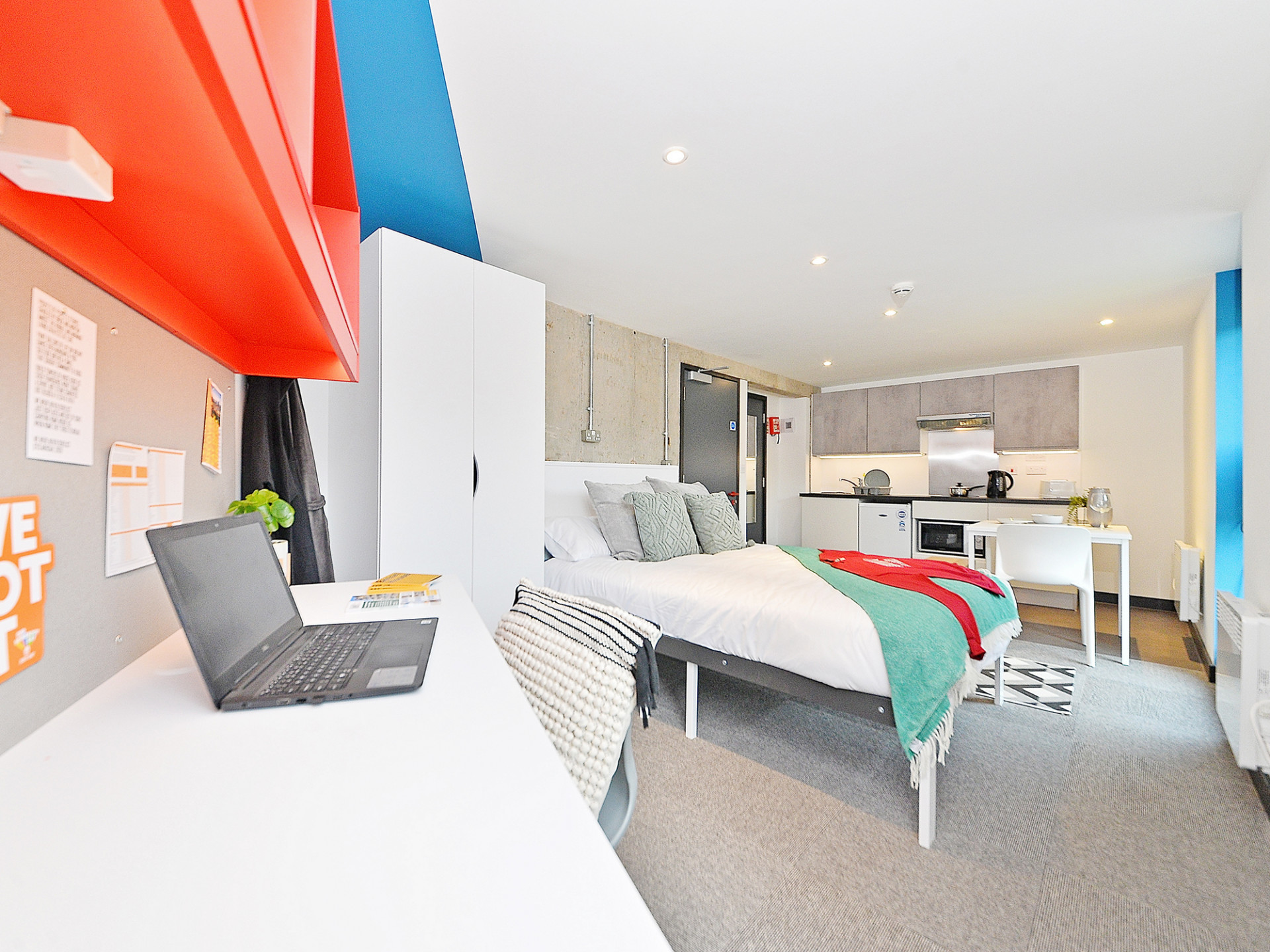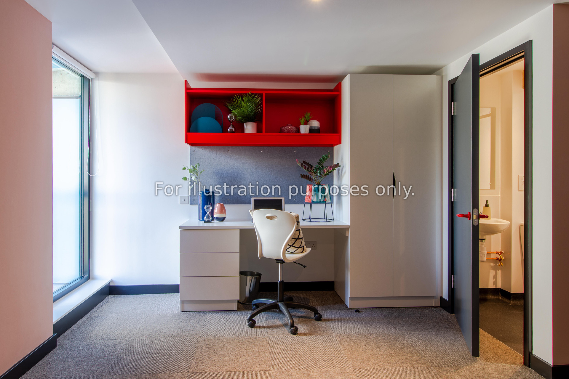 Studio为独立套房,带专属厨卫,适合注重独处空间的同学。每间均配全套家具——适双人床、宽幅学习书桌、大容量衣柜,收纳充足不杂乱