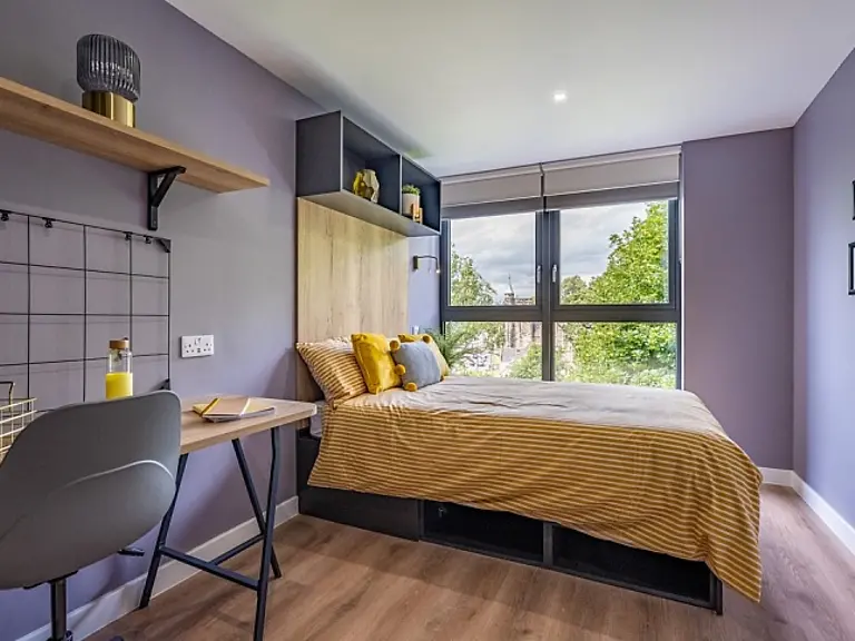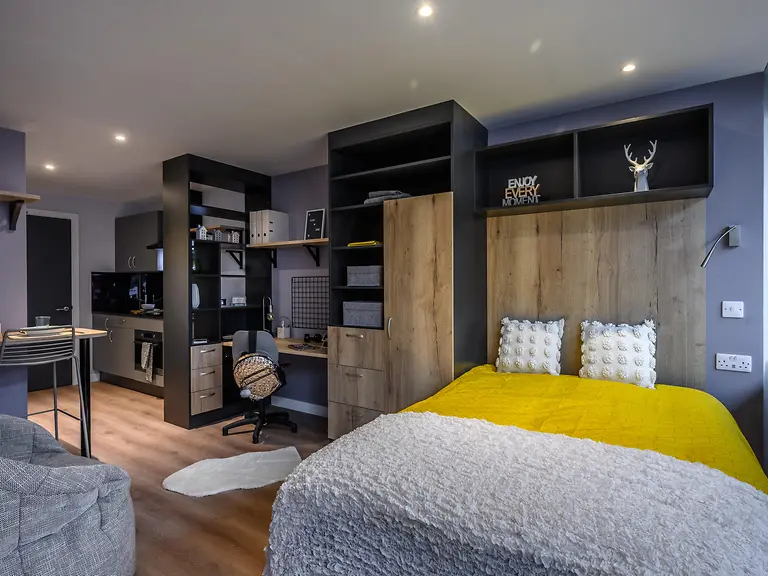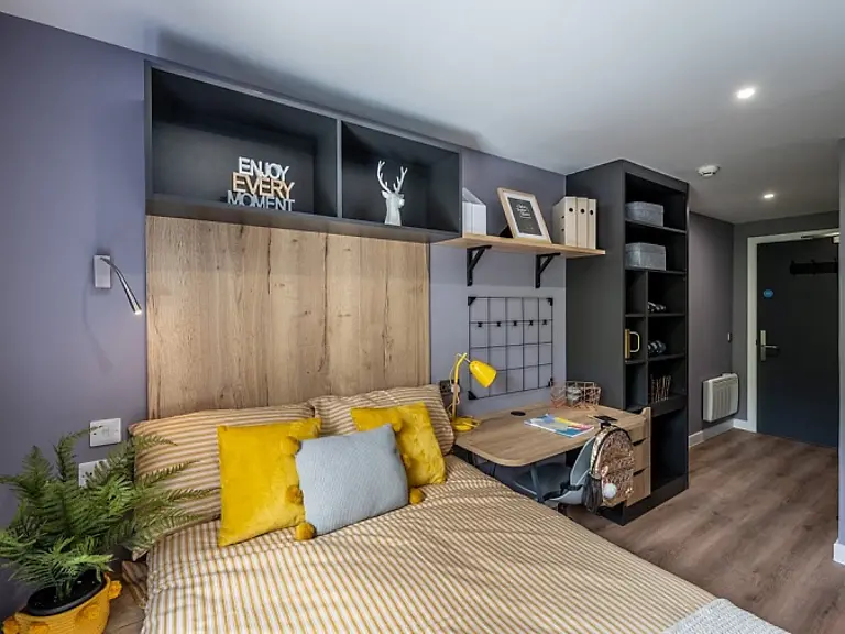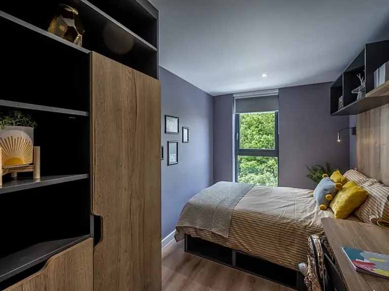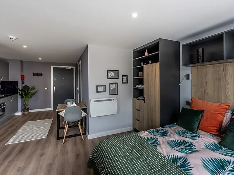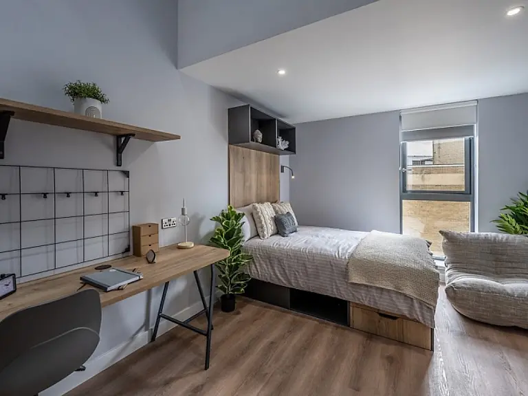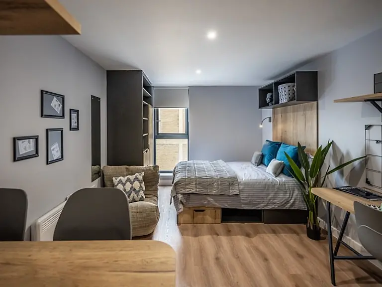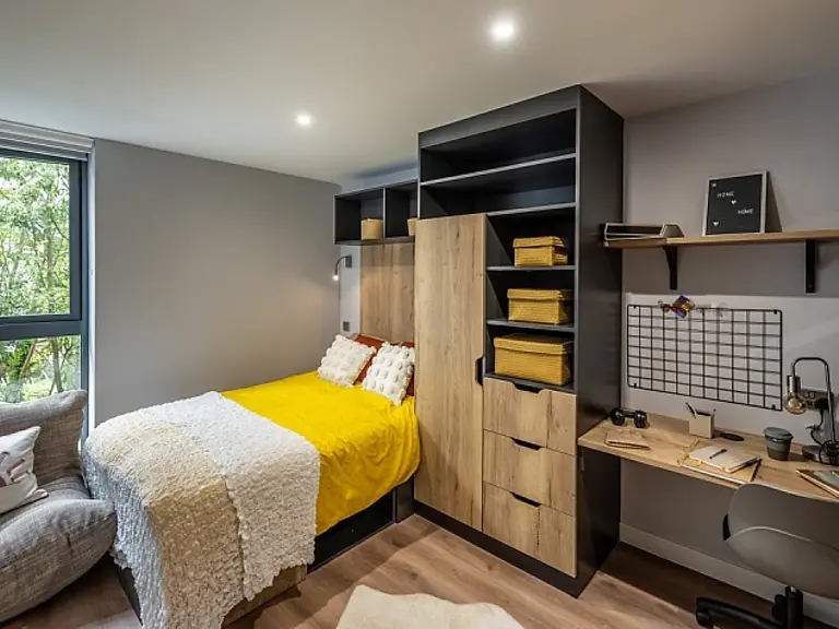 提供En-suite和Studio房型。装修是现代学生公寓的标准风格,干净实用。配备基本家具(床、书桌、衣柜),设计合理,能满足学习和休息的核心需求。