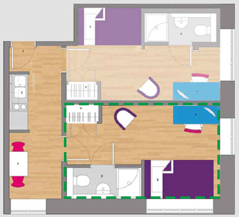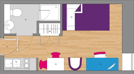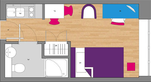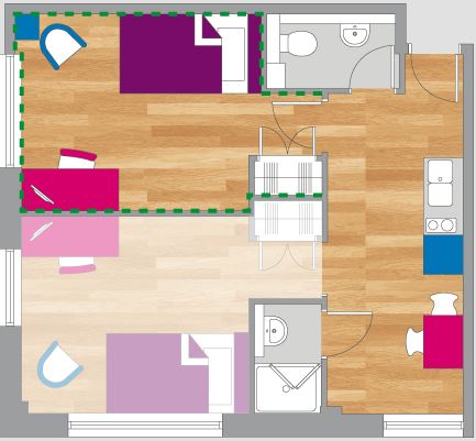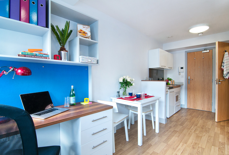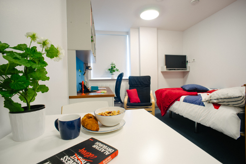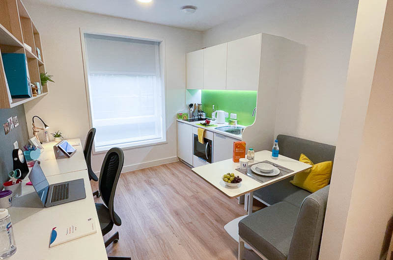 主要房型:独立Studio(26㎡起)与Twodio双人间,均含独立卫浴与厨房;配置:双人床(190cm x 140cm)、双书桌、充足储物空间及USB充电插座;舒适保障:全覆盖暖气、24小时热水,部分房间配备新风系统(需具体确认)