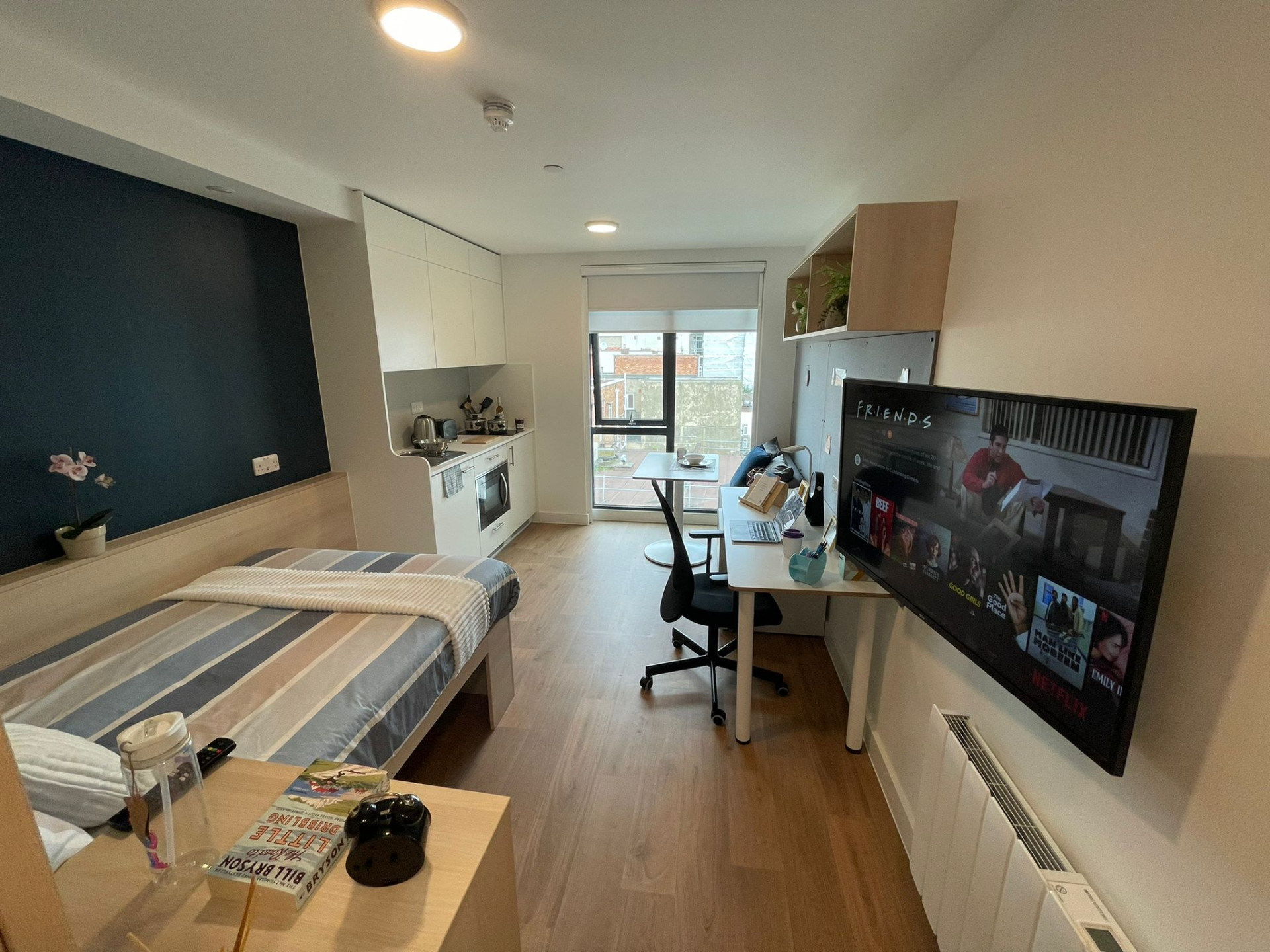 社交中心配备80英寸电视(含Sky Sports、Netflix等)、台球桌及公共厨房;24/7健身房与每周瑜伽课程,免费打包早餐(周一至周五);全天候茶咖供应、包裹代收及监控门禁,洗衣房含100英镑初始额度;维修团队与自习室随时支持学习生活需求。