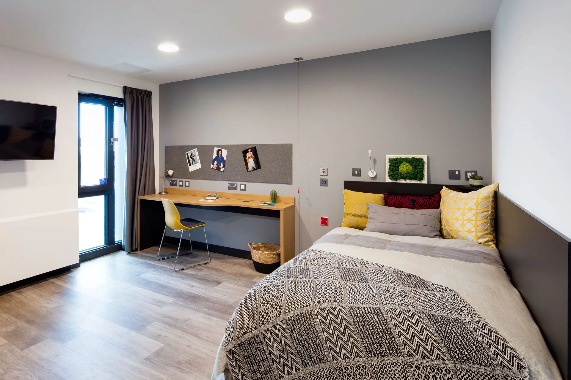 房间内部:studio 面积约 21-25㎡,ensuite 约 16-19㎡;均配 1.2 米单人床、可开启大窗户(通风顺畅,部分房间能看到校园绿植)、独立卫浴与紧凑型厨房(配小冰箱、电磁炉);全屋暖气 + 空调双配置,冬暖夏凉,适配都柏林海洋性气候。