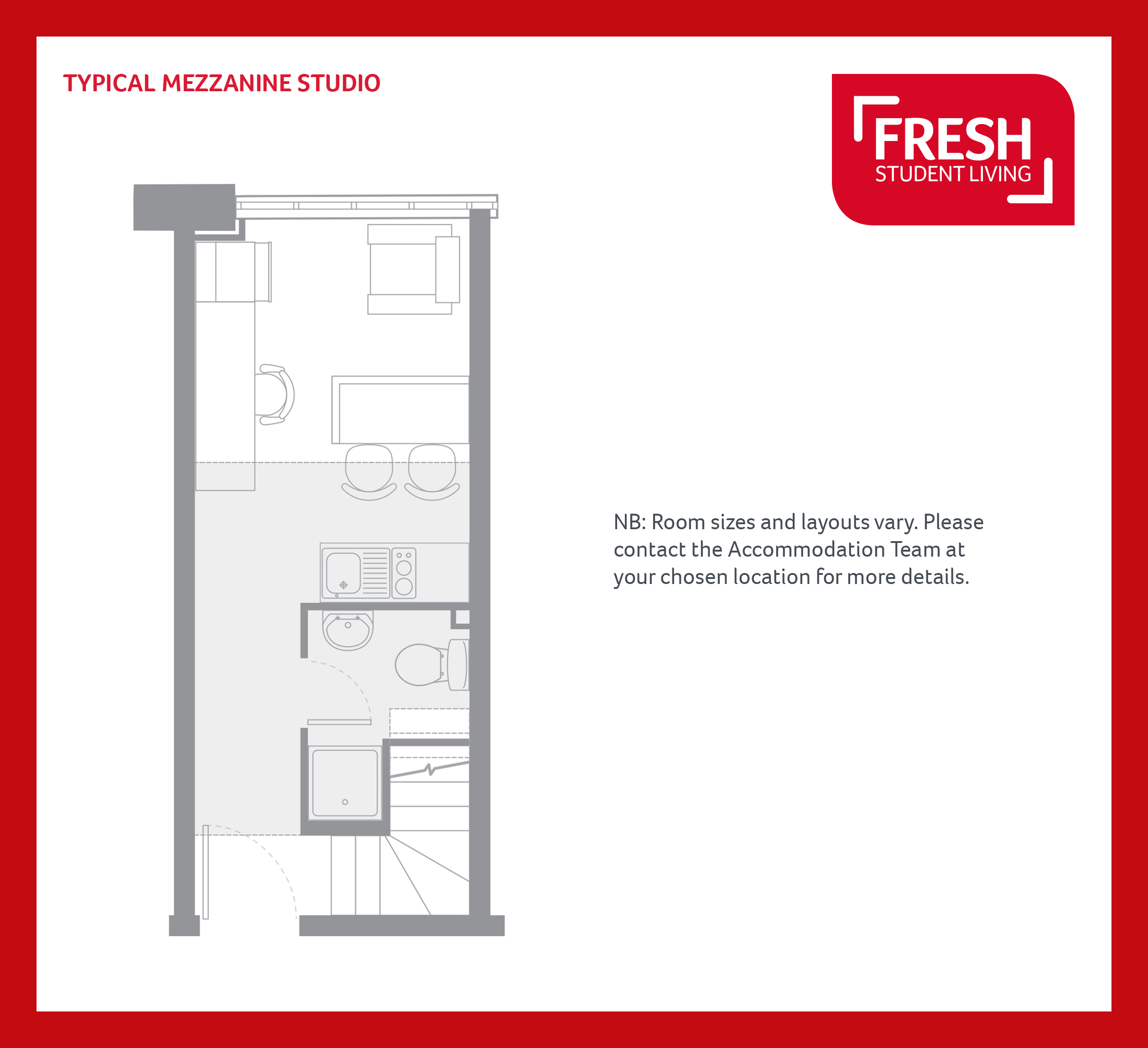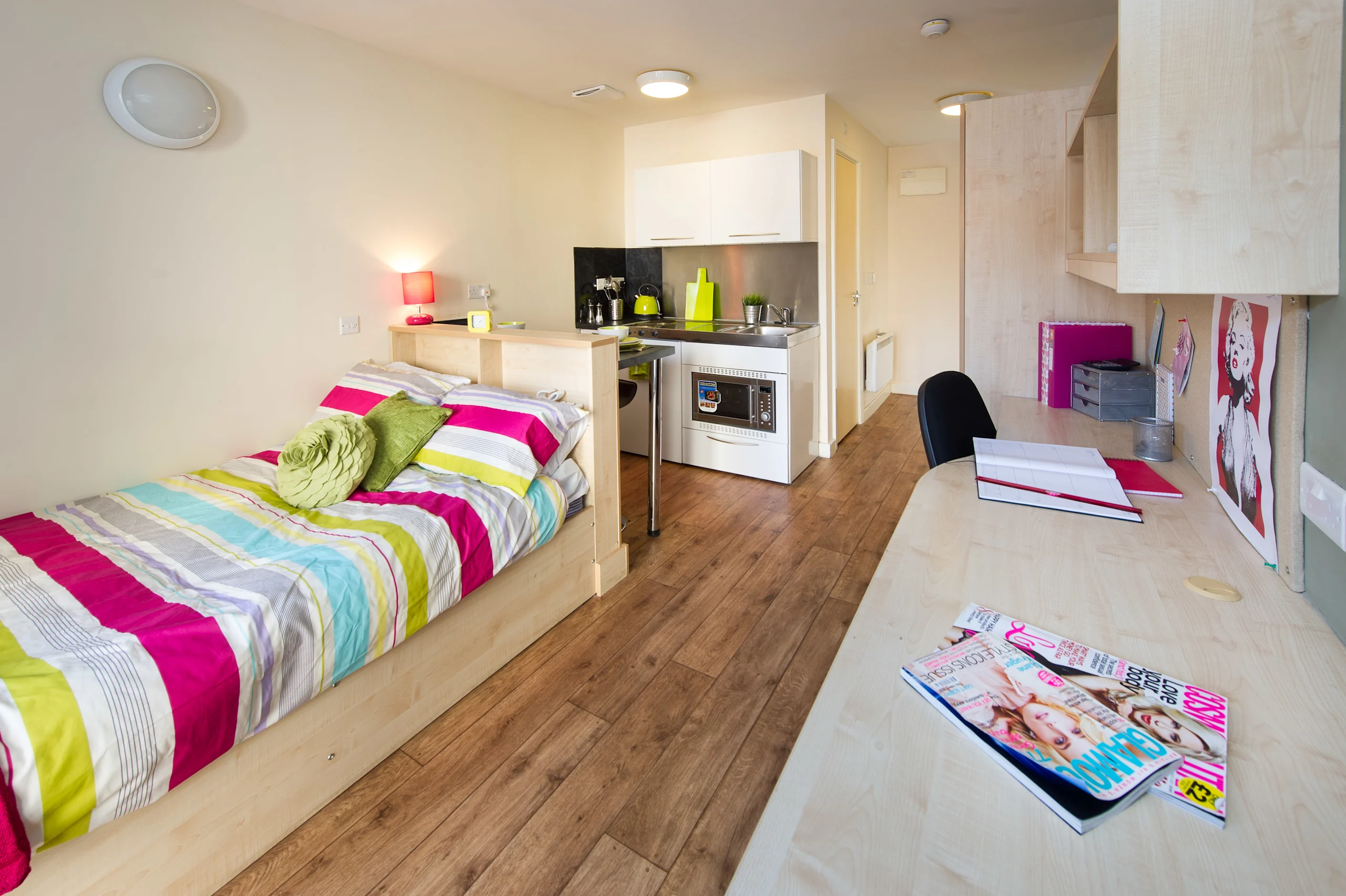 房型为18-26㎡ Studio,分多个档位可选,部分是夹层复式设计。均配小双人床、独立卫浴与可开窗户,独立厨房设备齐全,书桌储物空间充足,暖气供应稳定抗湿冷。