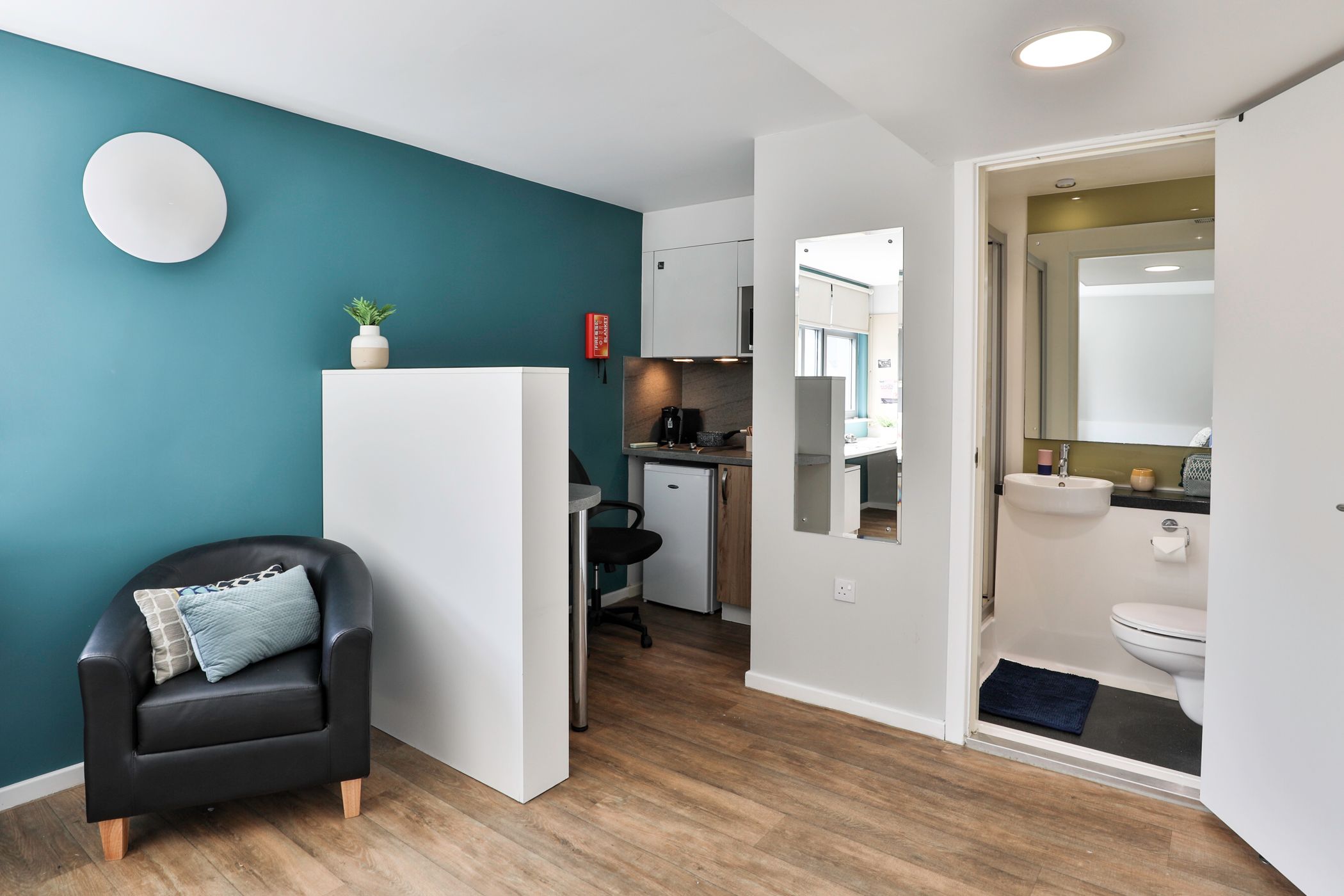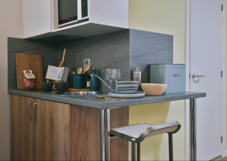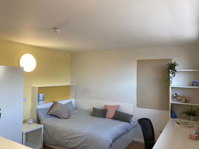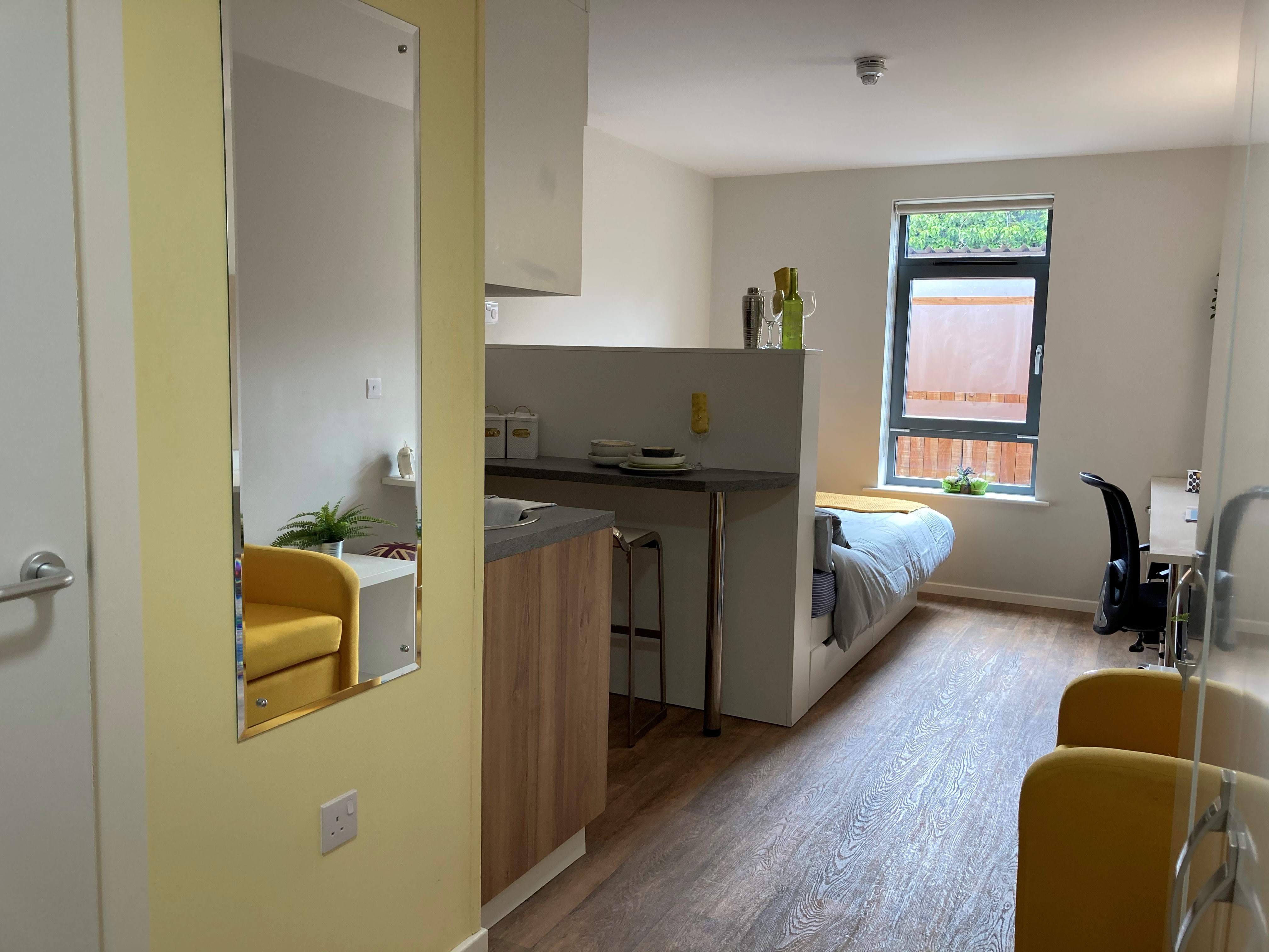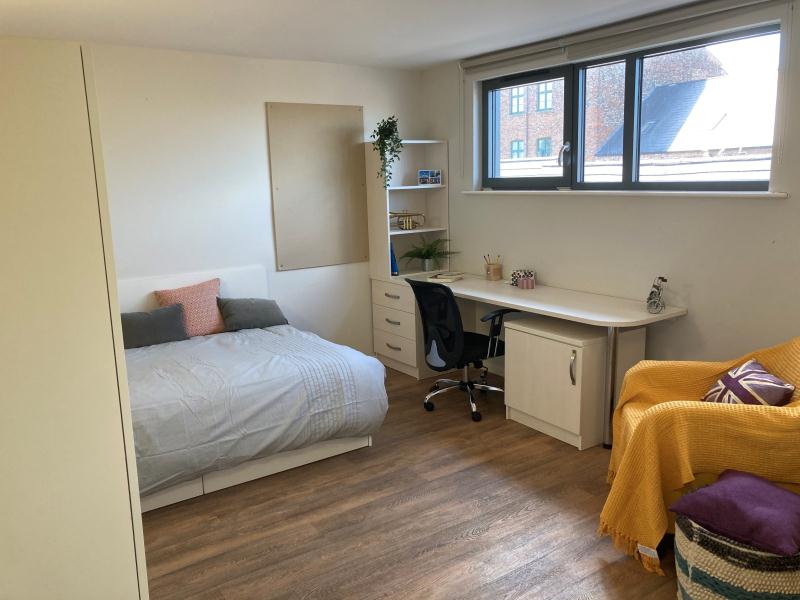房型为独Studio,面积 16-22㎡,空间宽敞通透。配舒适双人床、独立卫浴,采光通风俱佳,书桌、储物空间充足,独立厨房设备齐全(灶台、微波炉、冰箱),暖气系统稳定,适配约克湿冷气候。公共设施实用贴心,24 小时门禁 + 监控保障安全,设小型休闲区与自助洗衣房。覆盖高速免费 WiFi,提供快递代收、维修响应及时,独居生活也省心。