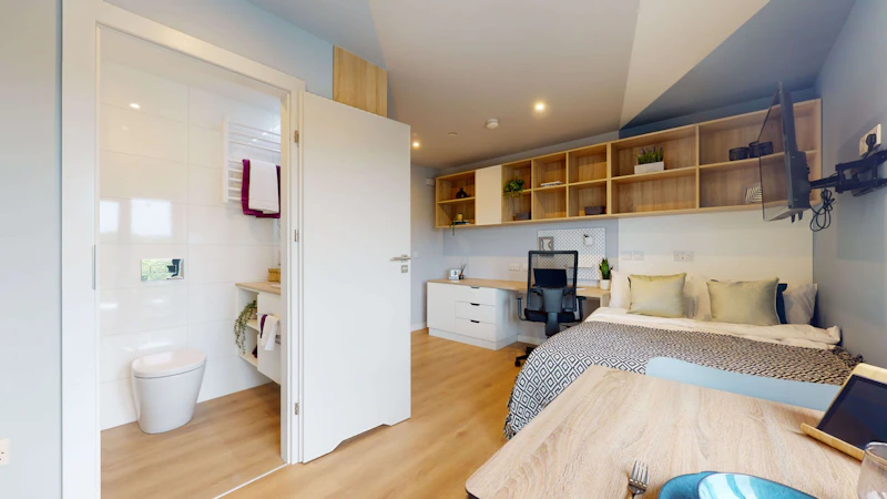 公寓提供3-Bed Ensuite和Studio 房型。ensuite 房型独立卫浴、共用厨房,是喜欢社交的学生的最佳选择;Studio房型独立卫浴、独立厨房,为学生提供更私密和自在的个人空间 。房间有大落地窗,视野采光比较好,配有双人床、书桌椅、衣柜、穿衣镜、电视等,有充足的储物空间。厨房配有灶台、冰箱、烤箱等,Ensuite 公共厨房有沙发、电视、茶几等。