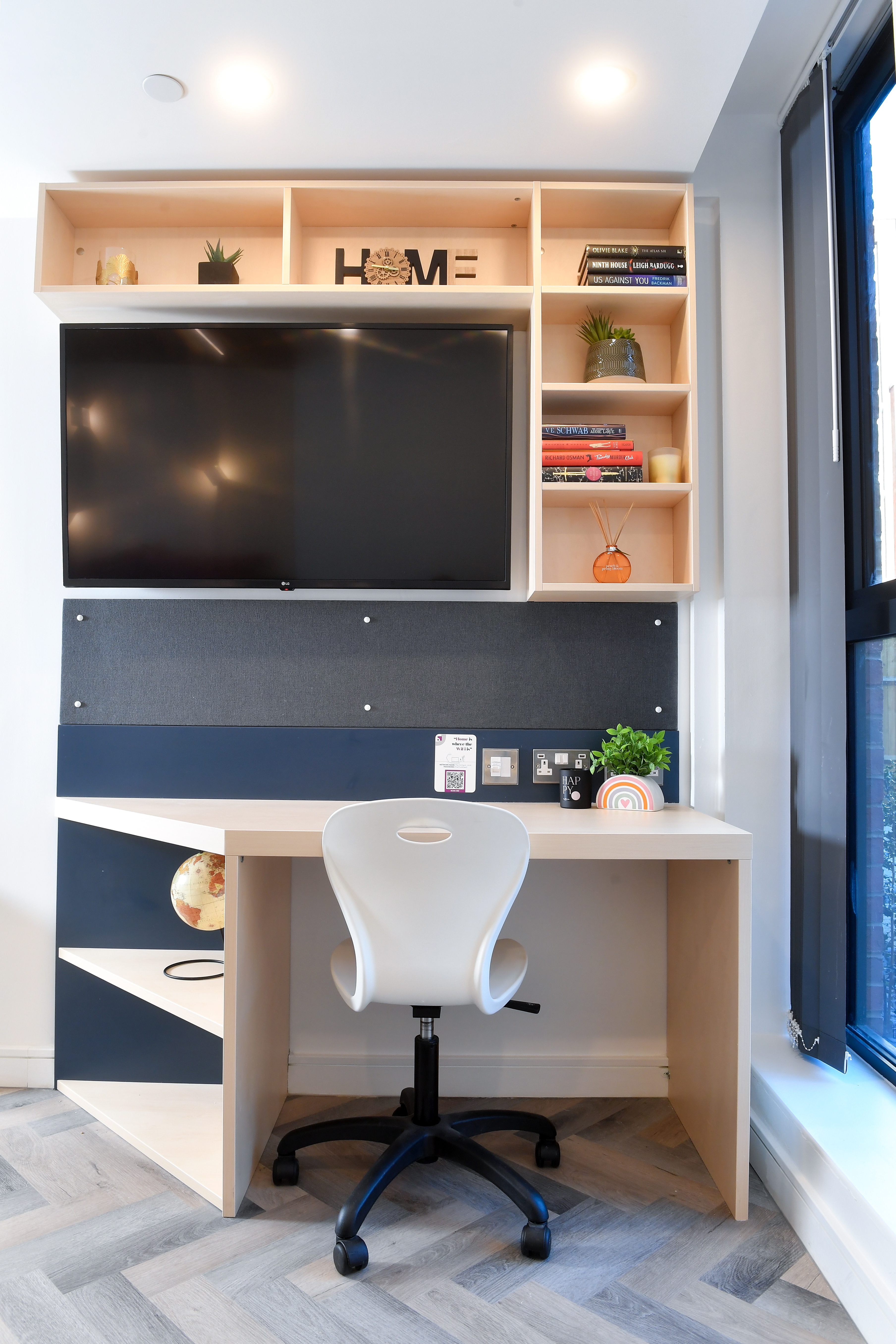 Studio:自带精装卧室、独立小厨房和套内浴室,隐私感拉满,适合偏爱独居的学生;配置超齐全,50 英寸智能电视、全高冰箱冰柜、微波烤箱一体机、电灶、抽油烟机、双人床、床下储物空间、单人沙发椅、定制衣柜、电暖气、水槽下热水器、淋浴加热器、书桌和椅子一应俱全,生活品质直接拉满,不用额外添置任何家具家电。