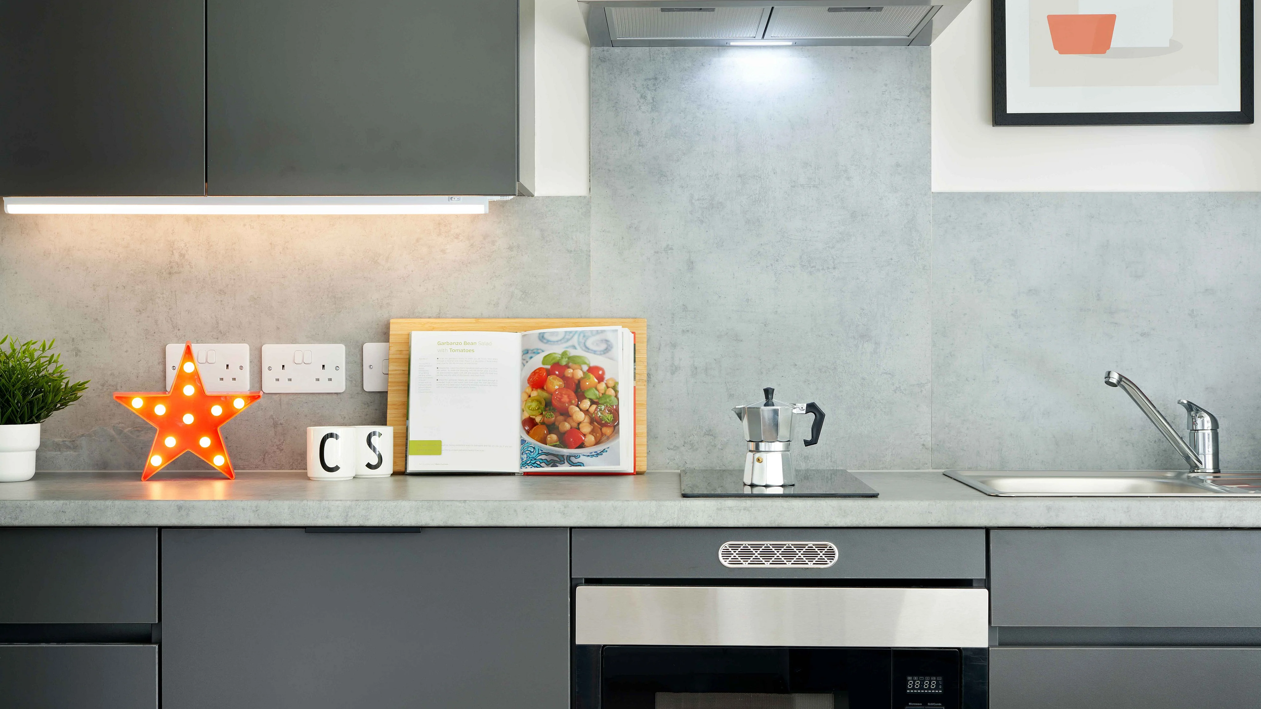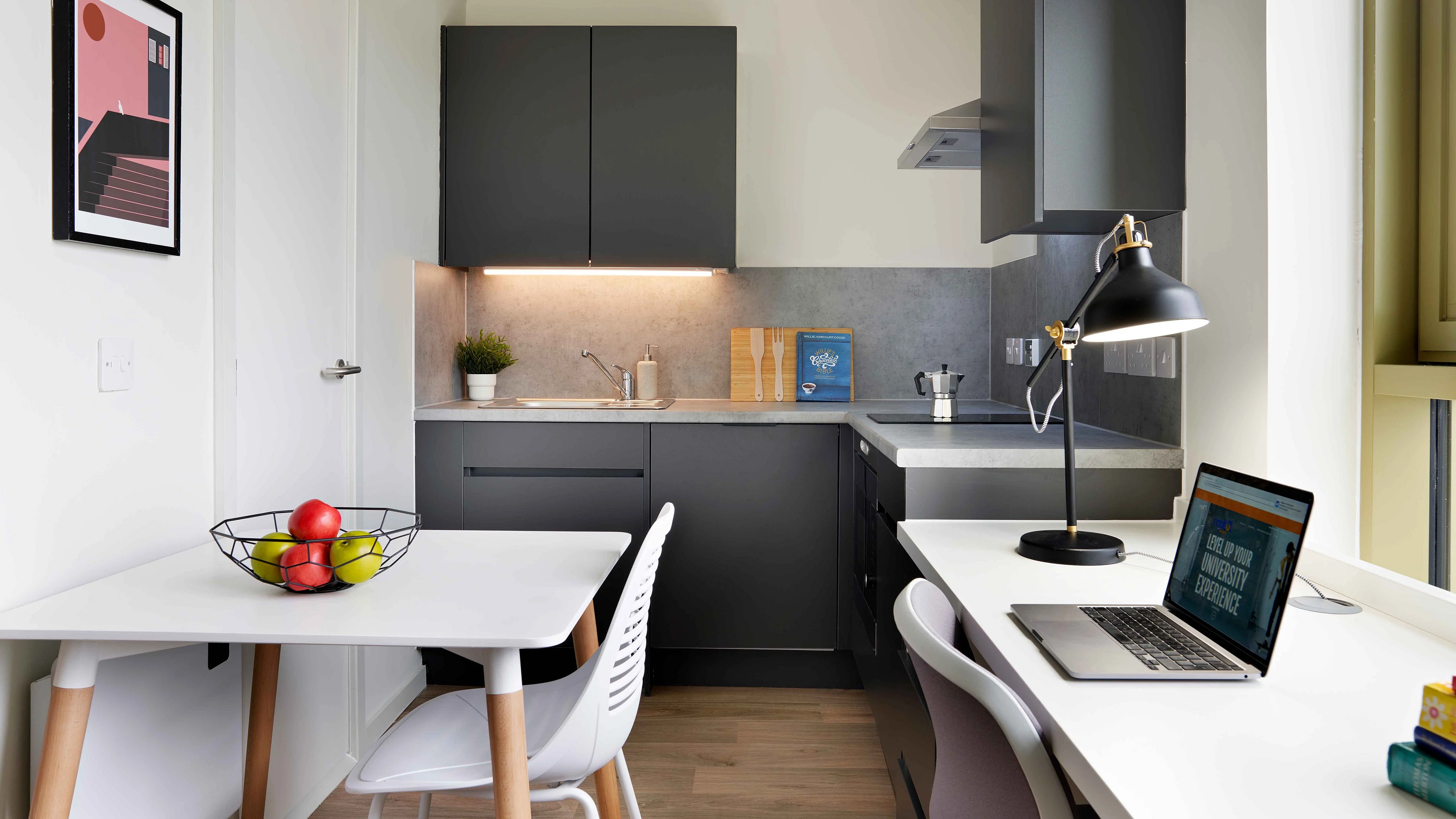 公寓提供套房和单间公寓,每个房间都设计简洁时尚,内部配备床、衣柜、书桌、椅子等基本设施。公共厨房配有冰箱、电磁炉、抽油烟机、微波炉和橱柜。