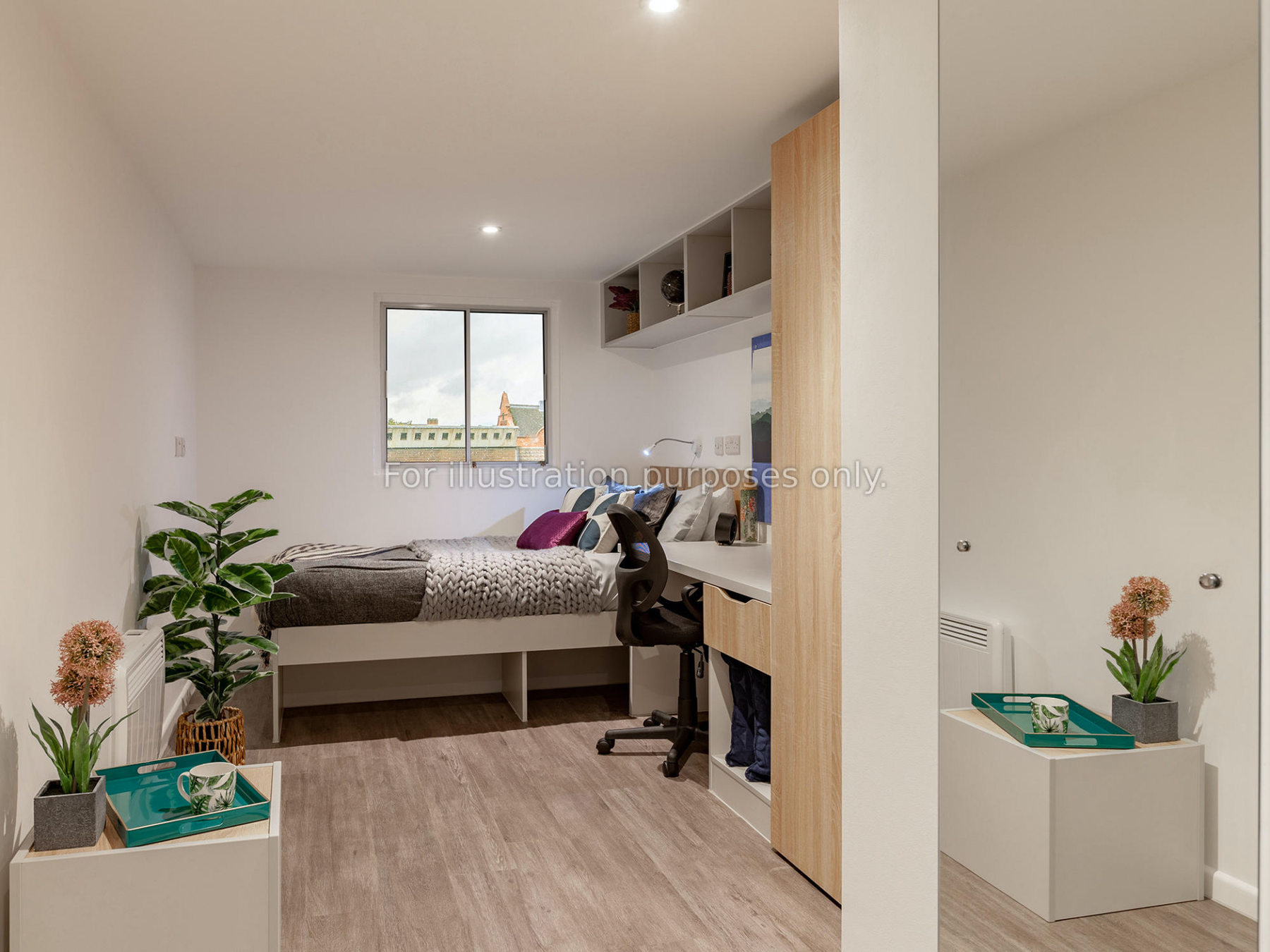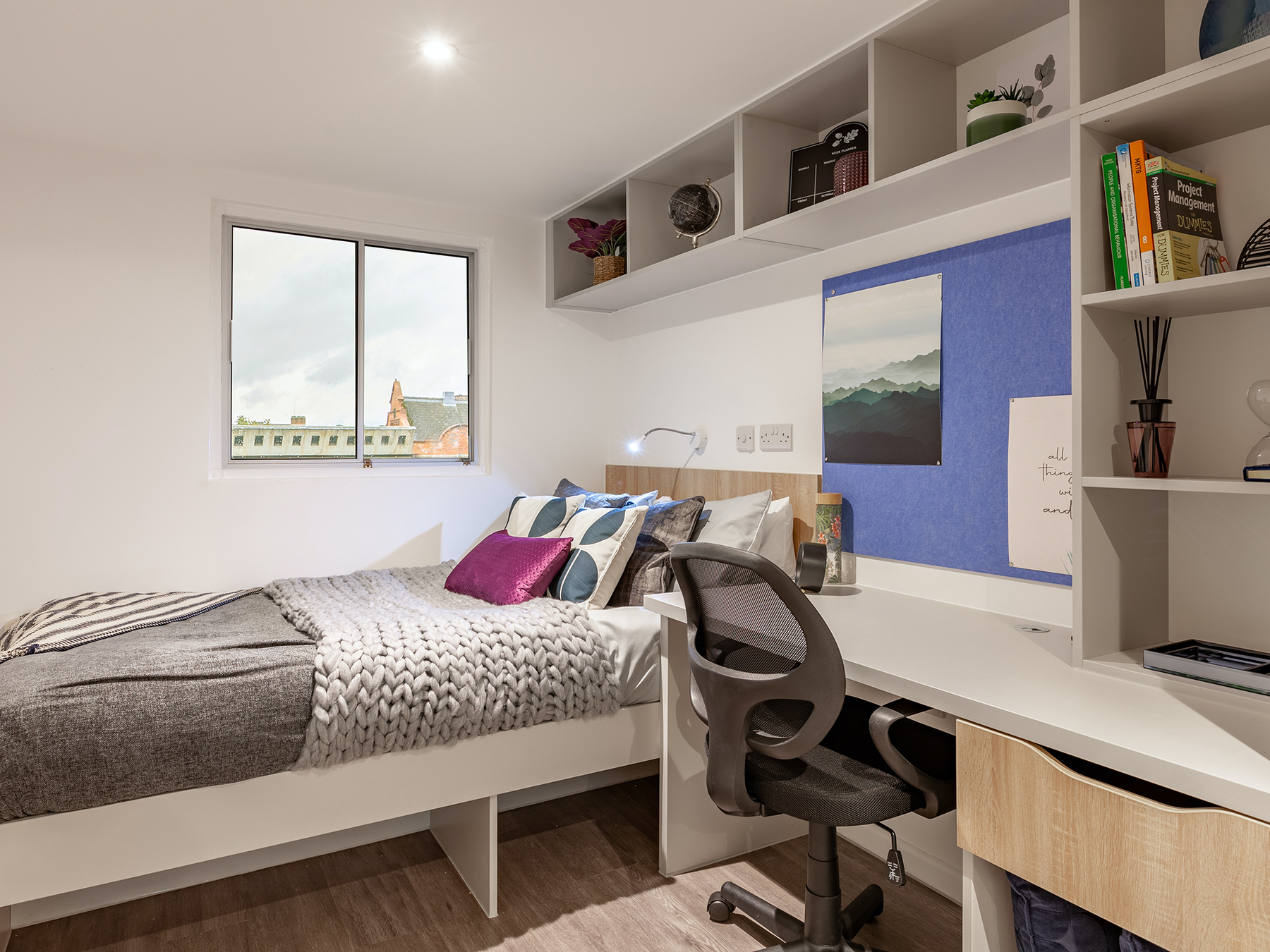 提供En-suite(4-8人共享厨房)、两室套房及Studio三种房型,配备独立卫浴、舒适大床与全景采光窗。定制书桌与储物系统优化空间,无障碍房型满足特殊需求。