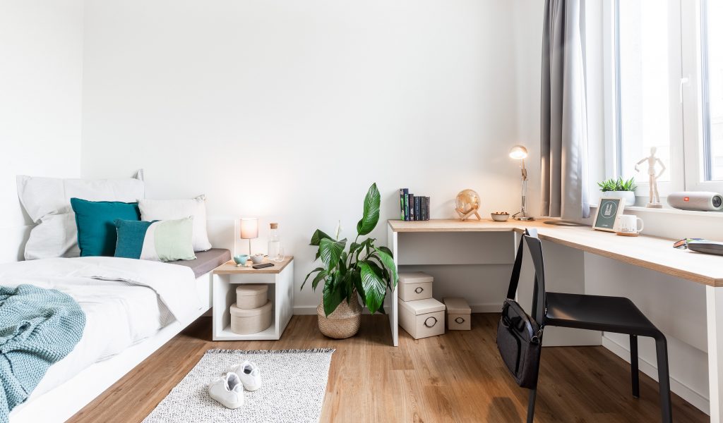 房间内部均为专属 studio 房型,空间布局合理,每间都配备独立卫浴与独立厨房,满足日常起居与烹饪需求。床型舒适适配留学生作息,窗户可灵活开合,通风采光俱佳,室内暖气供应充足,冬日也能保持温暖宜居的居住环境。