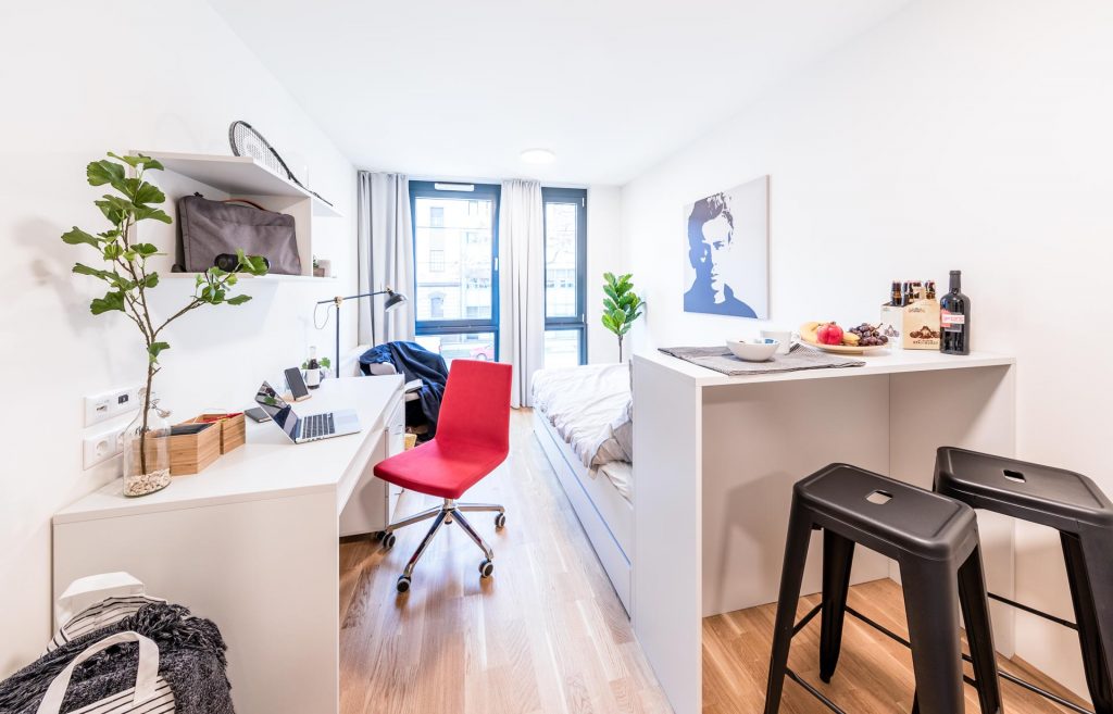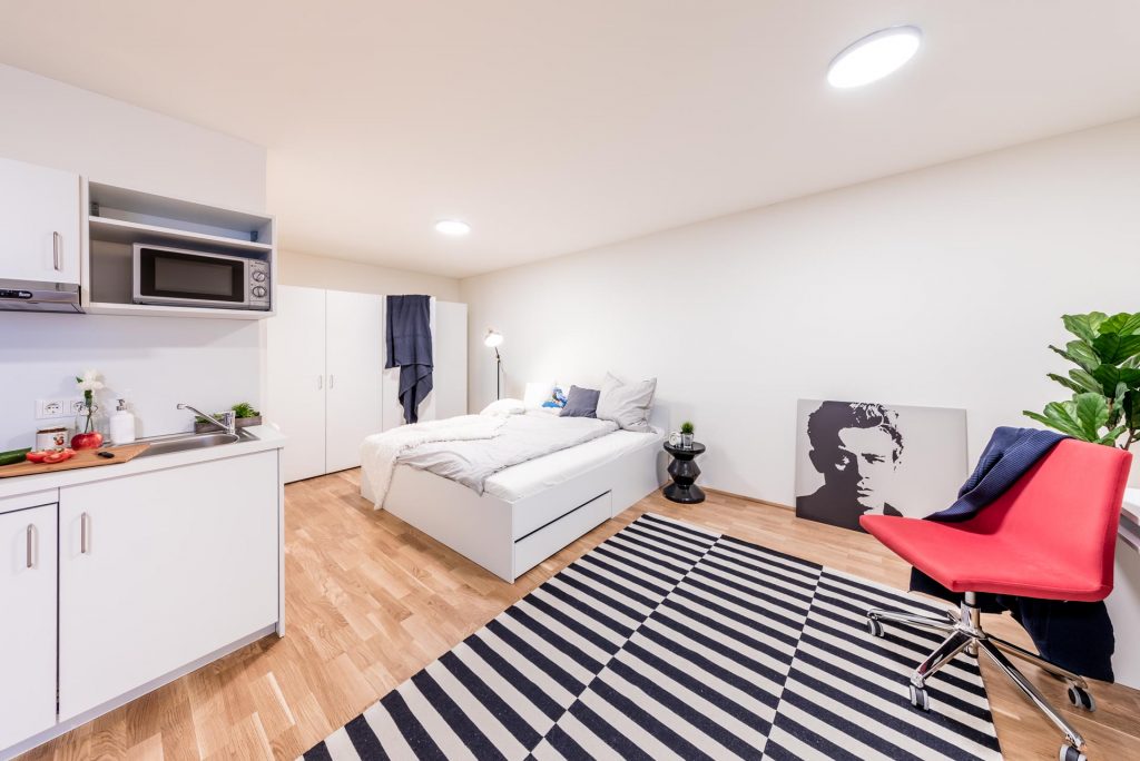 您可以在游戏房的公共区域和朋友一起玩桌上足球和台球。公寓还有健身房,同学您可以在里面锻炼。在公寓的8层有一个巨大的屋顶露台,您可以和朋友在那里一起沐浴阳光欣赏维也纳的美丽风景。公寓还有音乐室,您可以在那里创作音乐。公寓还有电影休息室,您可以在电影休息室欣赏大画幅电影几乎就像在电影院里一样。公寓提供自习室,您可以在自习室学习。您可以在地下车库为您的汽车租一个停车位(独立于租赁合同;可在 4 周前到月底取消)。您可以将您的自行车停放在可上锁的自行车地窖中。公寓免费借用家居用品,例如吸尘器、熨斗和熨衣板、晾衣架、棋盘游戏等。在营业时间内您可以在前台领取您的快递包裹。洗衣房在地下室,您无需出门即可全天候清洗和烘干(需付费)。所有公共区域都处于视频监控之下。保安服务在晚上和周末值班。我们的员工接受过急救和防火方面的培训,以便在紧急情况下能够正确快速地做出反应。我们的公共区域、书房、健身室、电影和游戏区、社区厨房和户外区域已根据现行法规进行了升级和改造。