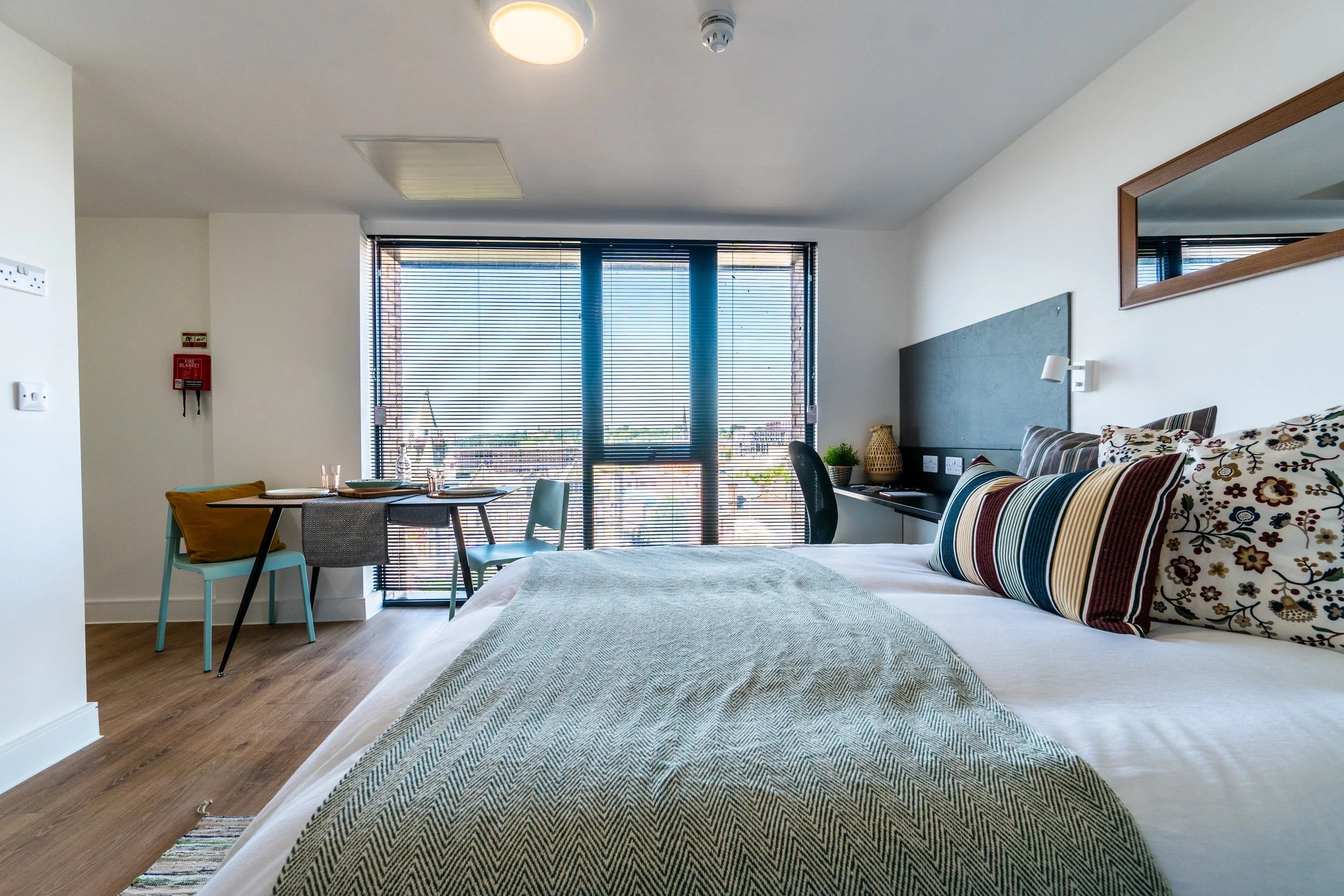 En-suite Plus rooms 为 2-5 人合租户型,独立卫浴搭配共享厨房,空间更舒适,适合重视社交与隐私平衡的学生。Studio rooms 是独立开间房型,配备独立卫浴、设备齐全的小厨房、双人床与学习区,可实现独立生活,起租价 £210 / 周。Studio Plus studios 是宽敞升级款房型,在标准 Studio 基础上增加额外休闲空间,适配追求奢华与独立居住体验的学生。