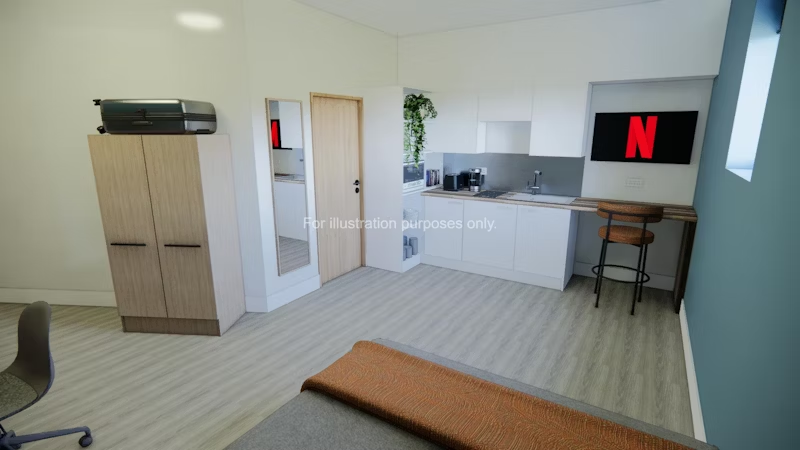 主力房型为Studio,有独立卫浴和厨房,空间布局实用。公寓内设有健身房、公共区域、电影院、自习室和洗衣房,每间客房都配备特大号床,有充足的休息空间。