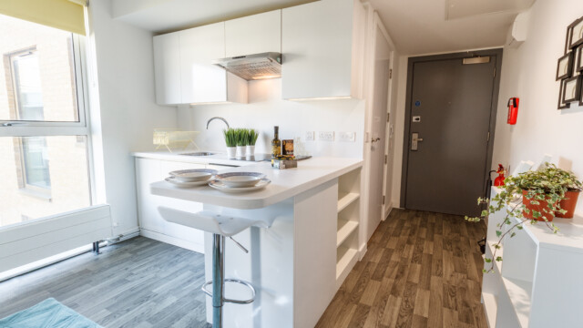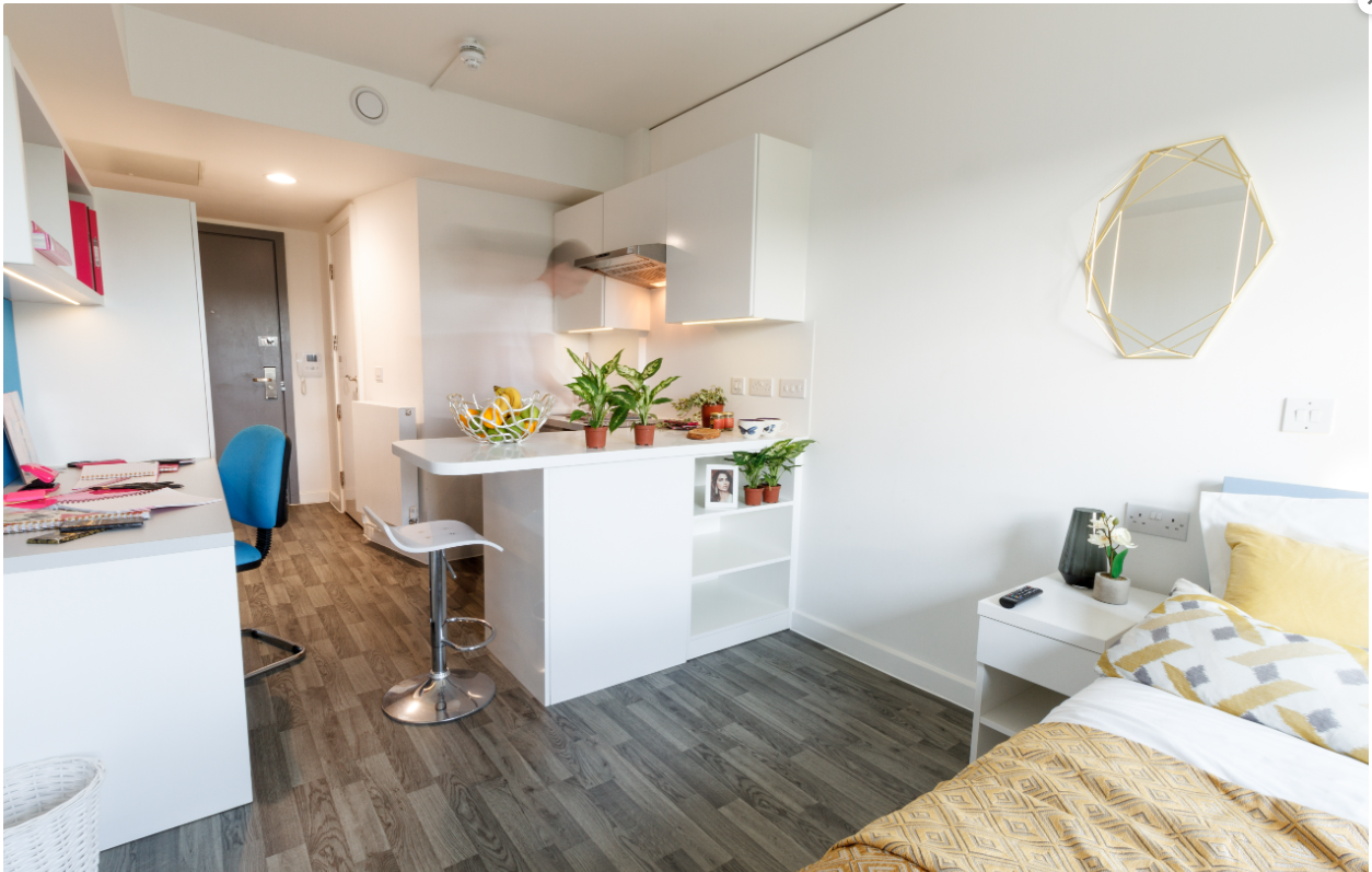 -公寓主要提供studio户型,面积16-26平,均配备了私人淋浴室和设备齐全的厨房(包含早餐吧台),让你在异国他乡也能轻松打理自己的生活。