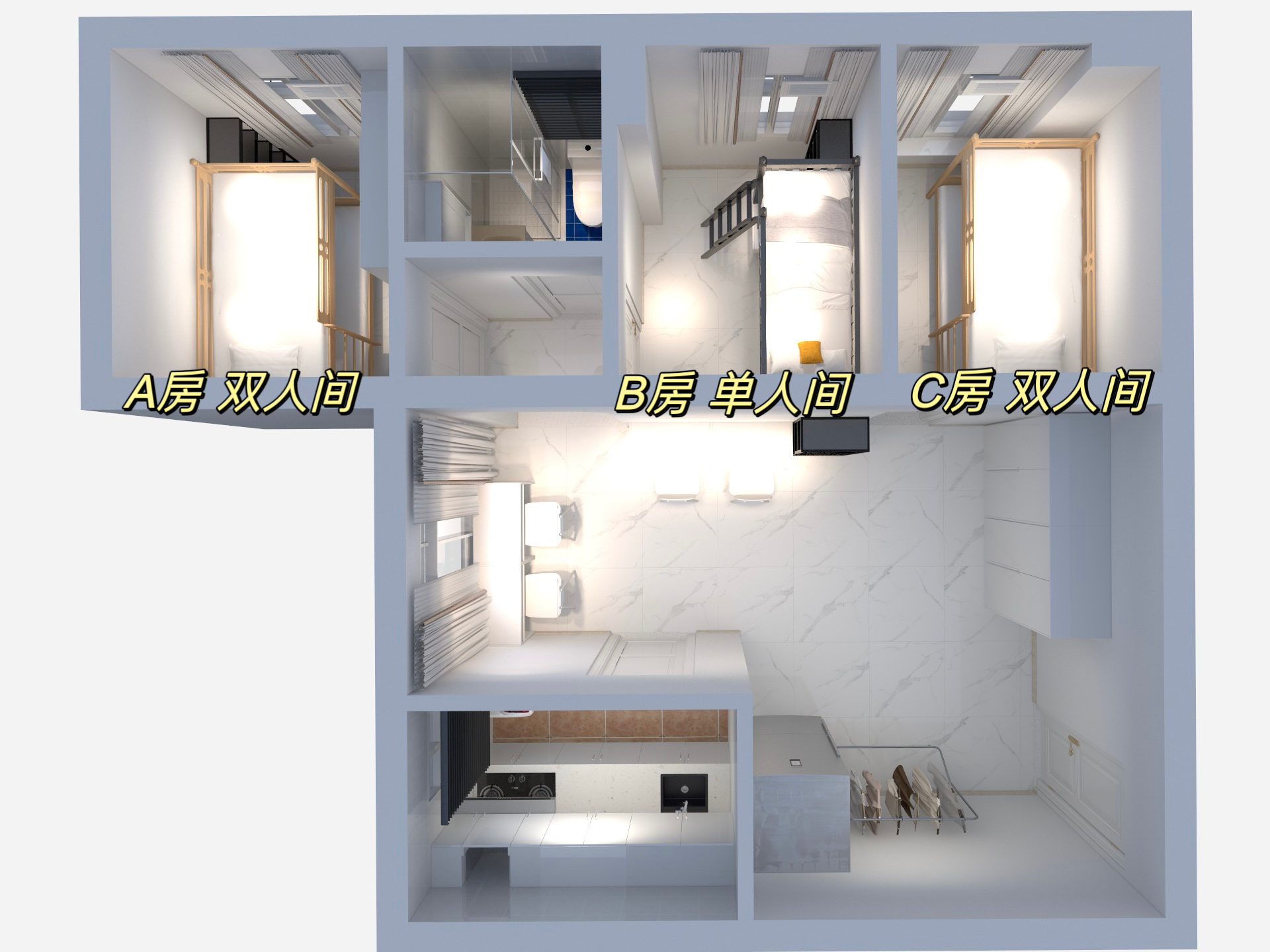 公共区域内标配洗⼿池、冰箱、 洗⾐机、冷⽓机、晾⾐架、热⽔器、电磁炉/煮⻝炉