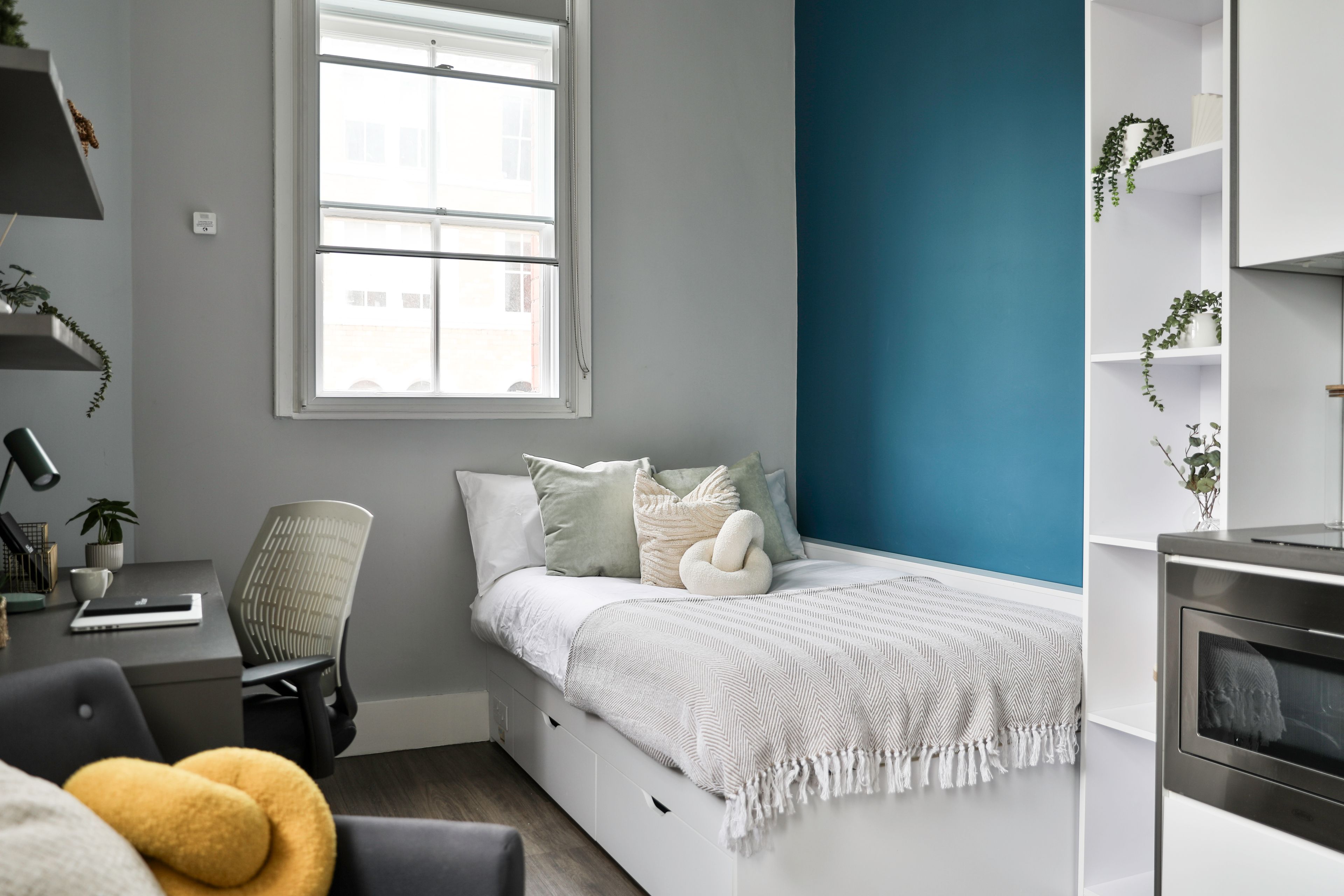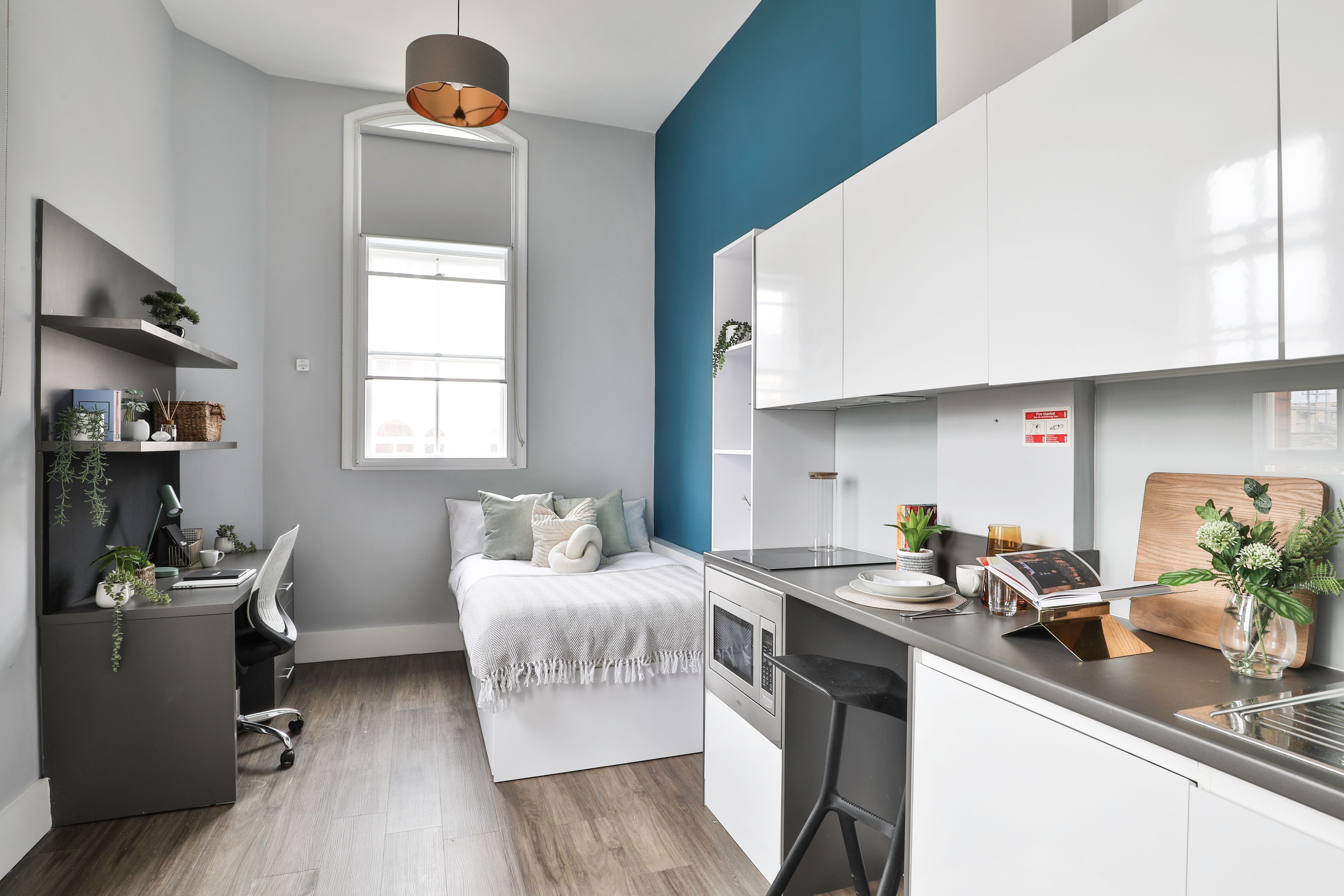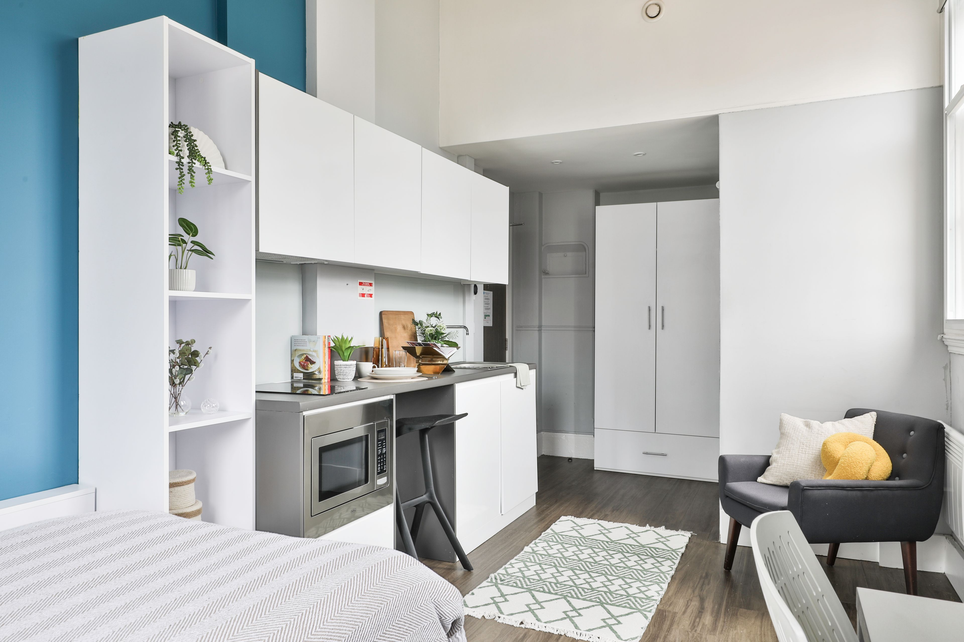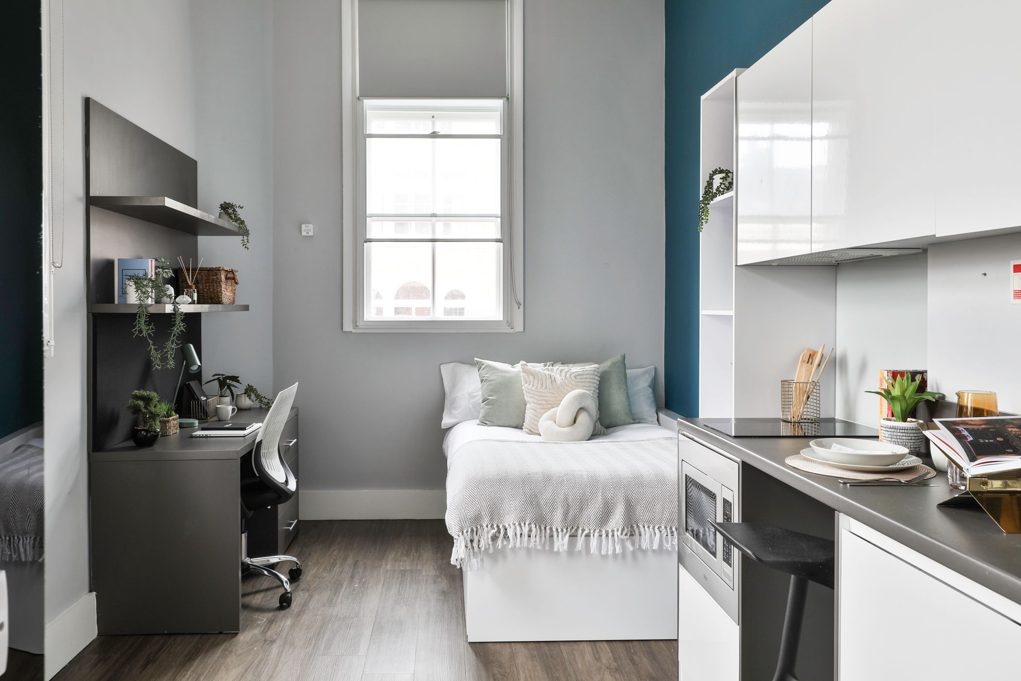 公寓提供2-bed Ensuite和Studio 房型。ensuite 房型独立卫浴、共用厨房,是喜欢社交的学生的最佳选择;Studio房型独立卫浴、独立厨房,为学生提供更私密和自在的个人空间。 房间配有双人床、书桌椅、衣柜、穿衣镜等,有充足的储物空间。厨房配有灶台、冰箱、烤箱等。