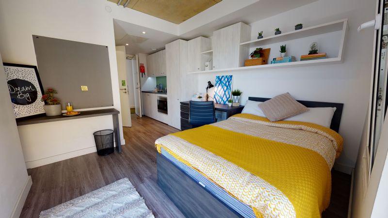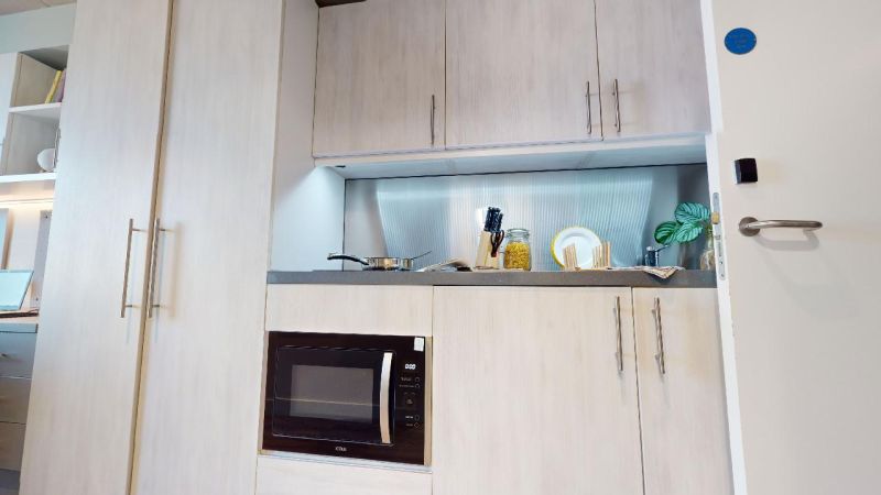 全房型配质感家具:Studio 带独立厨卫,面积 9-17㎡实用不局促;Ensuite 共享大厨房,卧室带独立卫浴 +衣柜,储物空间充足,换季衣物、行李箱都能轻松收纳。房间内高速 WiFi全覆盖,暖气可智能调节,双层隔音窗隔绝金融城人流噪音,晚上赶 due、休息都不受干扰,拎包就能入住。