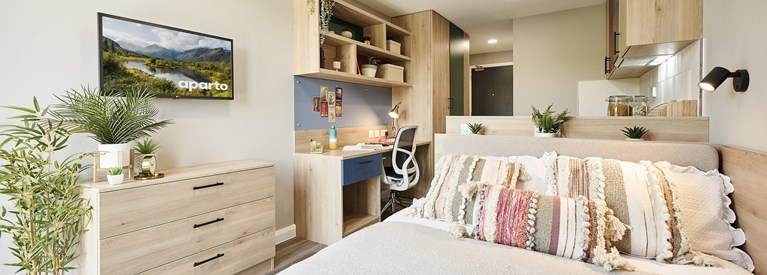 牛津城中心轻奢学生公寓!主打 Studio 及Twin房型,房租全包水电暖、高速 WiFi 与财产保险,步行 8 分钟直达牛津大学主校区,毗邻牛津城堡,兼具历史氛围与现代居住体验。