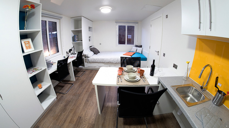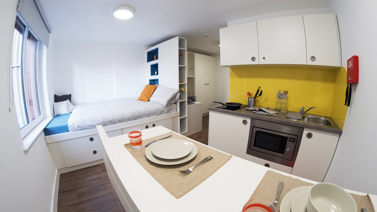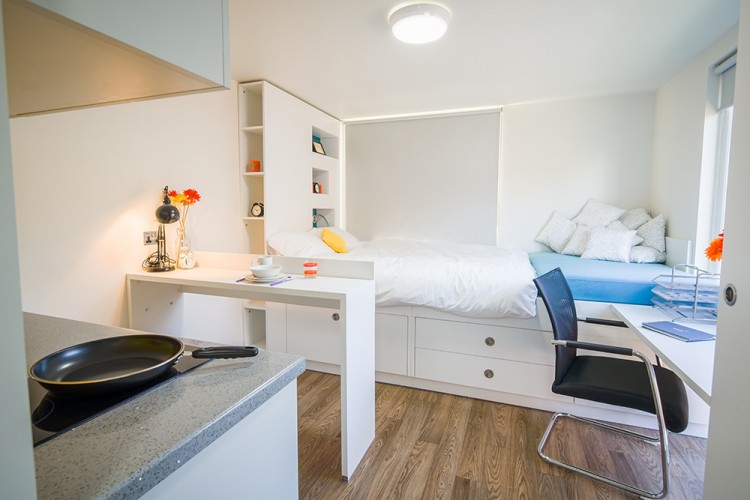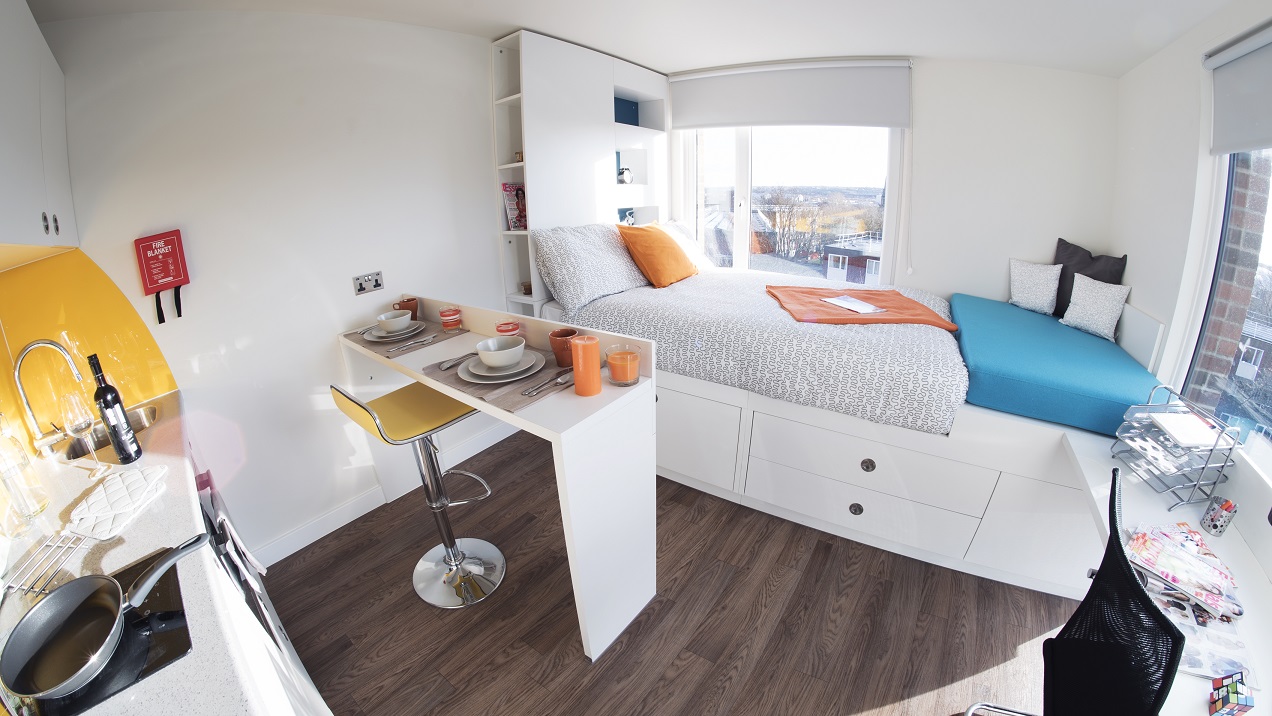 公寓目前主要提供 Stuio房型,Studio房型独立卫浴、独立厨房,为学生提供更私密和自在的个人空间。公寓房间配有双人床、书桌椅、衣柜、穿衣镜等,有充足的储物空间。厨房配有灶台、冰箱、烤箱等。